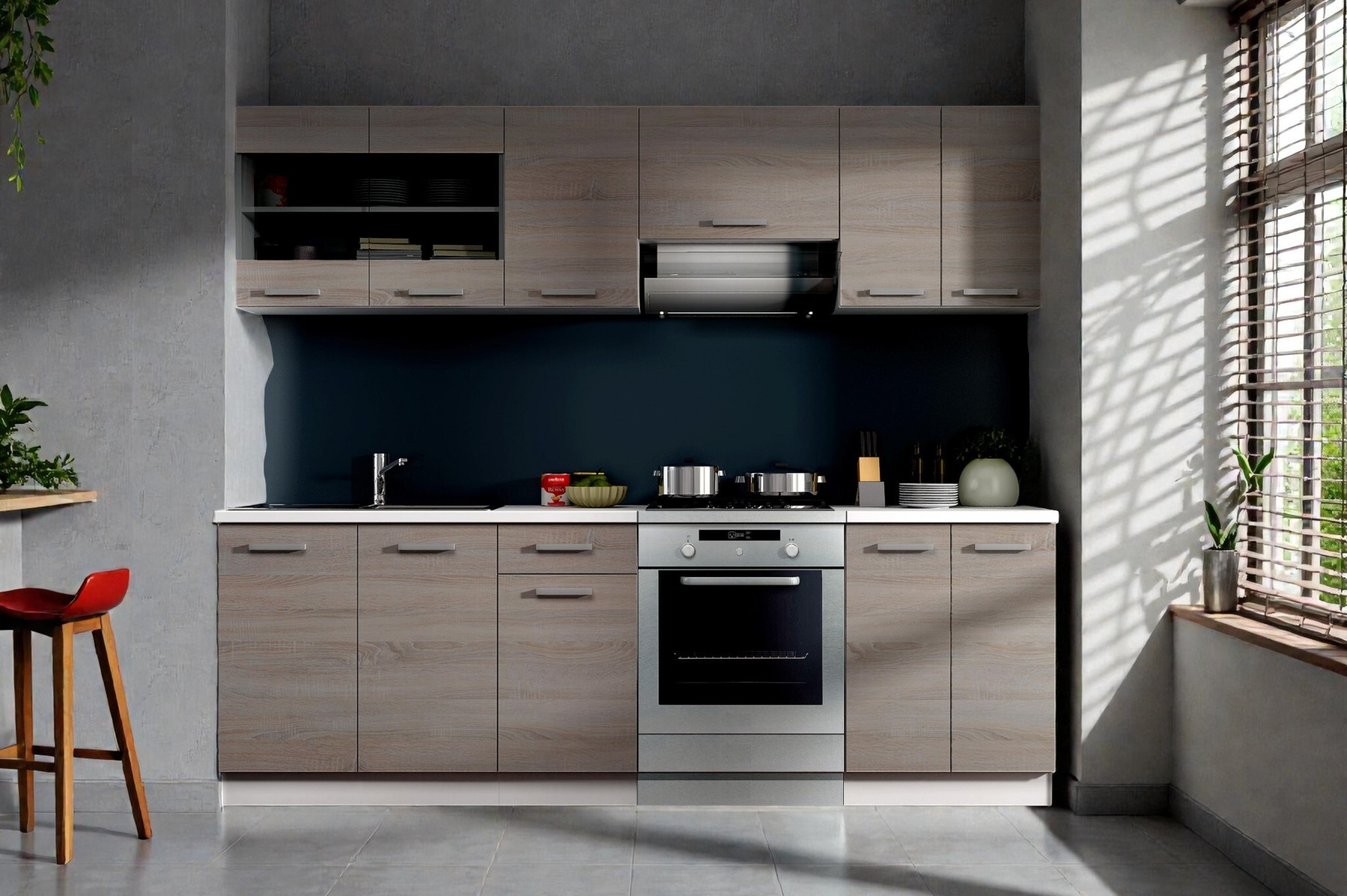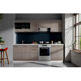 Tato kuchyňská linka v dekoru dub sonoma trufl je ideální volbou pro ty, kteří hledají funkční, cenově dostupné a esteticky sladěné řešení do menších bytů, na chaty nebo do nájemních prostor. Díky své světlé vnitřní části a výrazné struktuře dřeva na povrchu působí linka čistě a útulně.