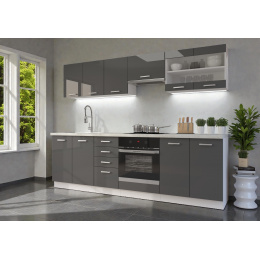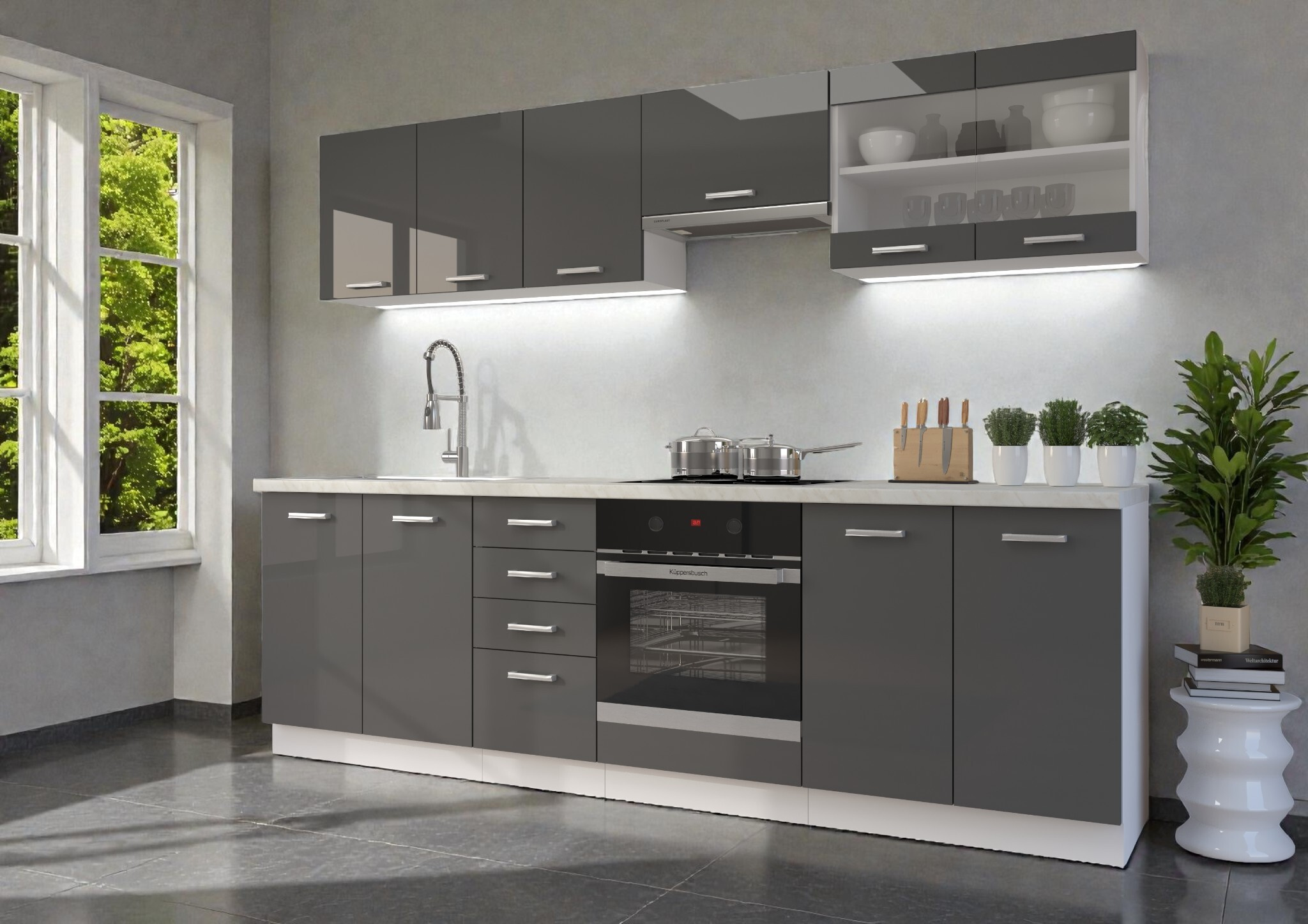 Hledáte kuchyni, která dodá vašemu domovu moderní šmrnc a prosvětlí prostor? Tato sestava v provedení šedý lesk je perfektní volbou pro ty, kteří preferují minimalistický styl a snadnou údržbu. Díky prémiovým materiálům a čistému designu se stane stylovým srdcem vaší domácnosti.