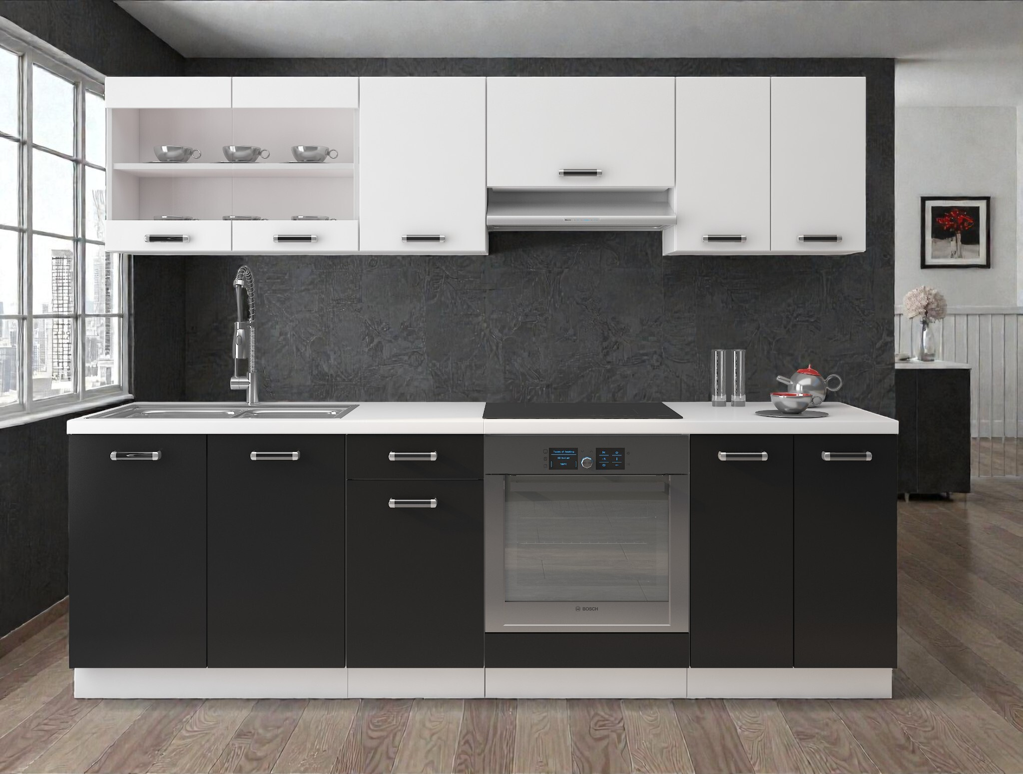 Hledáte stylovou kuchyni, která kombinuje moderní vzhled s maximální efektivitou nákladů? Tato sestava v černobílém provedení je ideálním řešením pro startovací bydlení, studentské byty nebo chaty. Kontrastní kombinace barev dodává prostoru moderní dynamiku a čistotu.