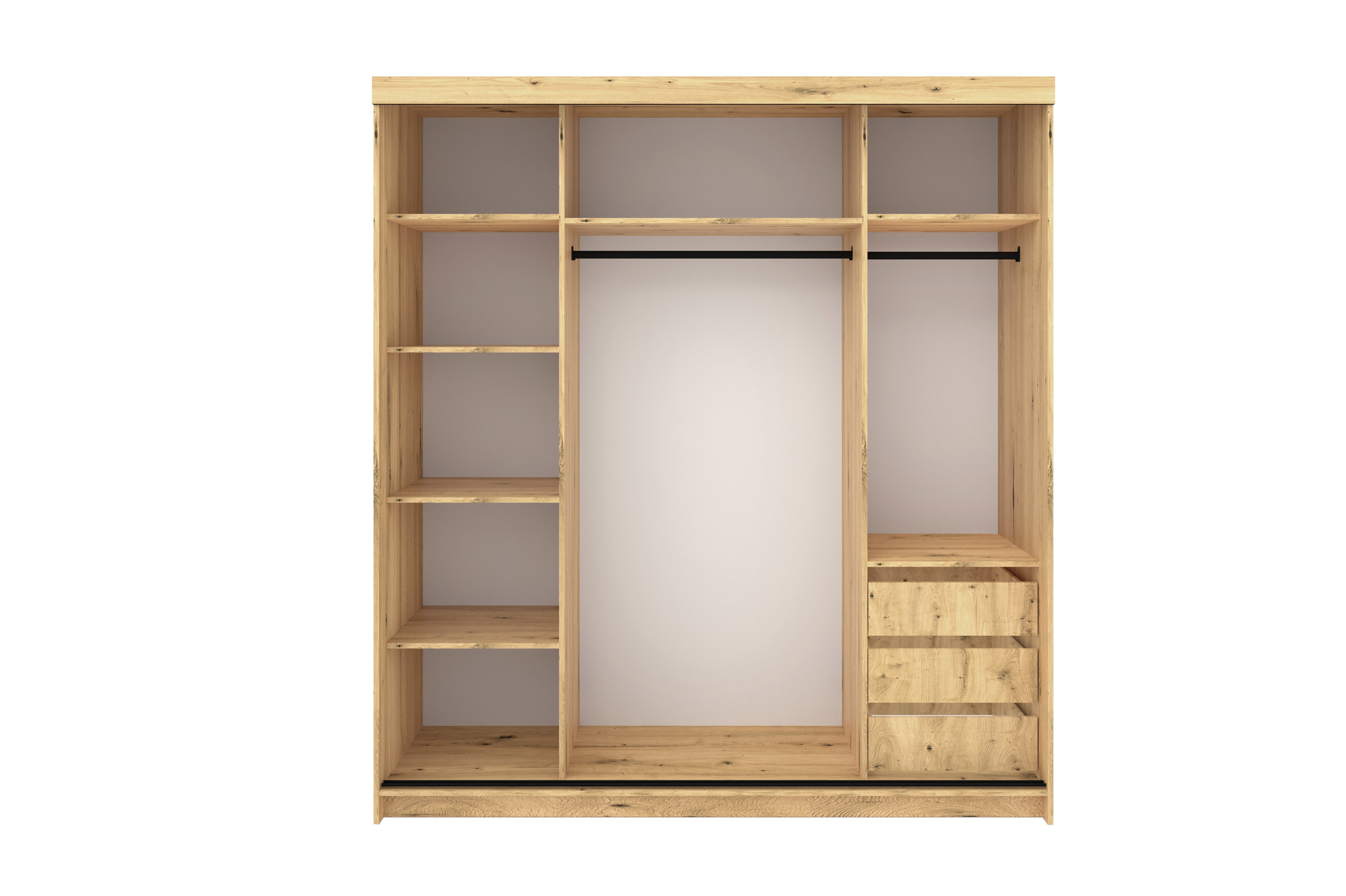 Náš tip: Model o šířce 250 cm je ideální volbou pro páry – nabízí dostatek místa pro dvě oddělené šatní zóny a centrální část se šuplíky pro společné doplňky.