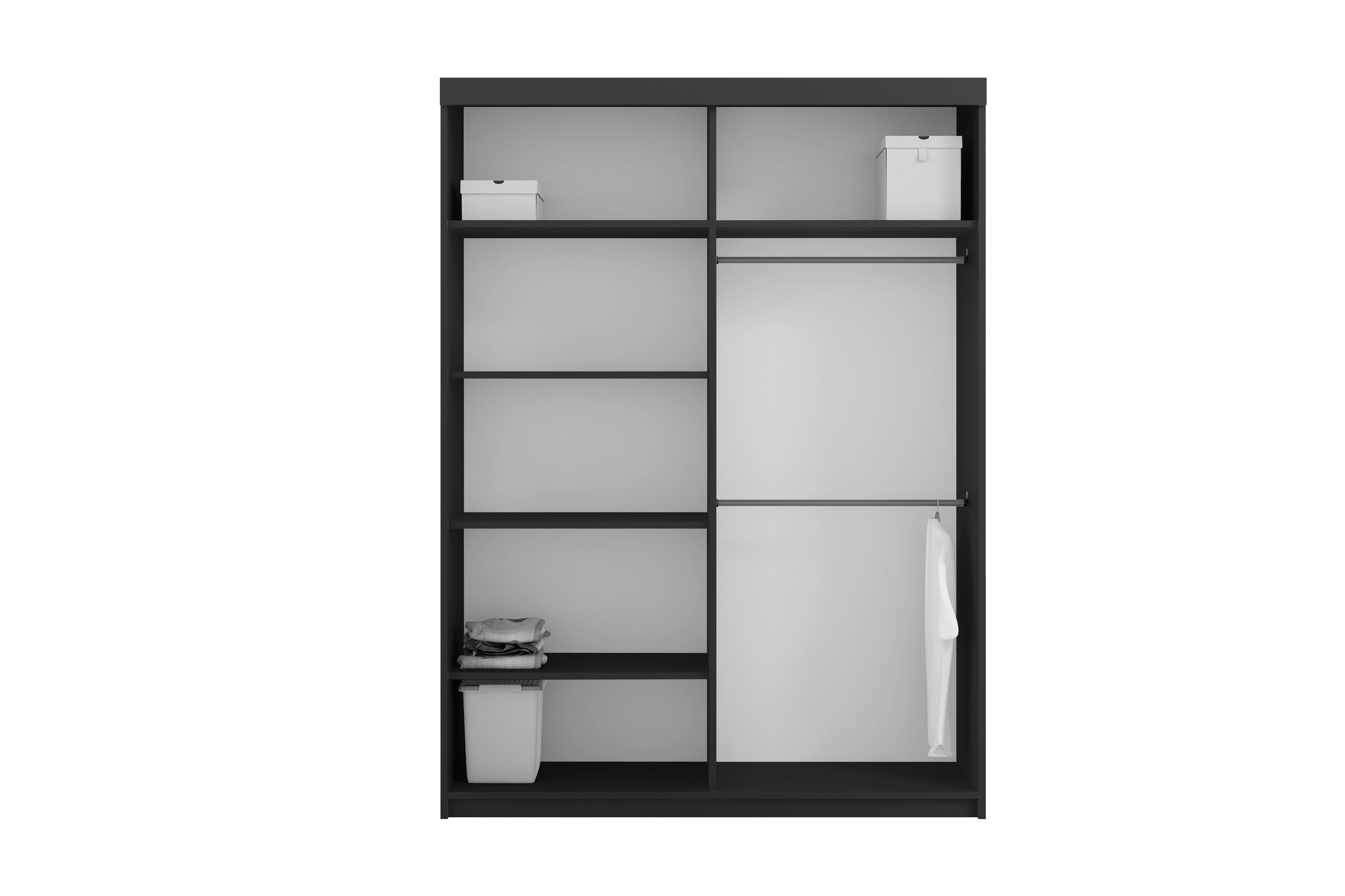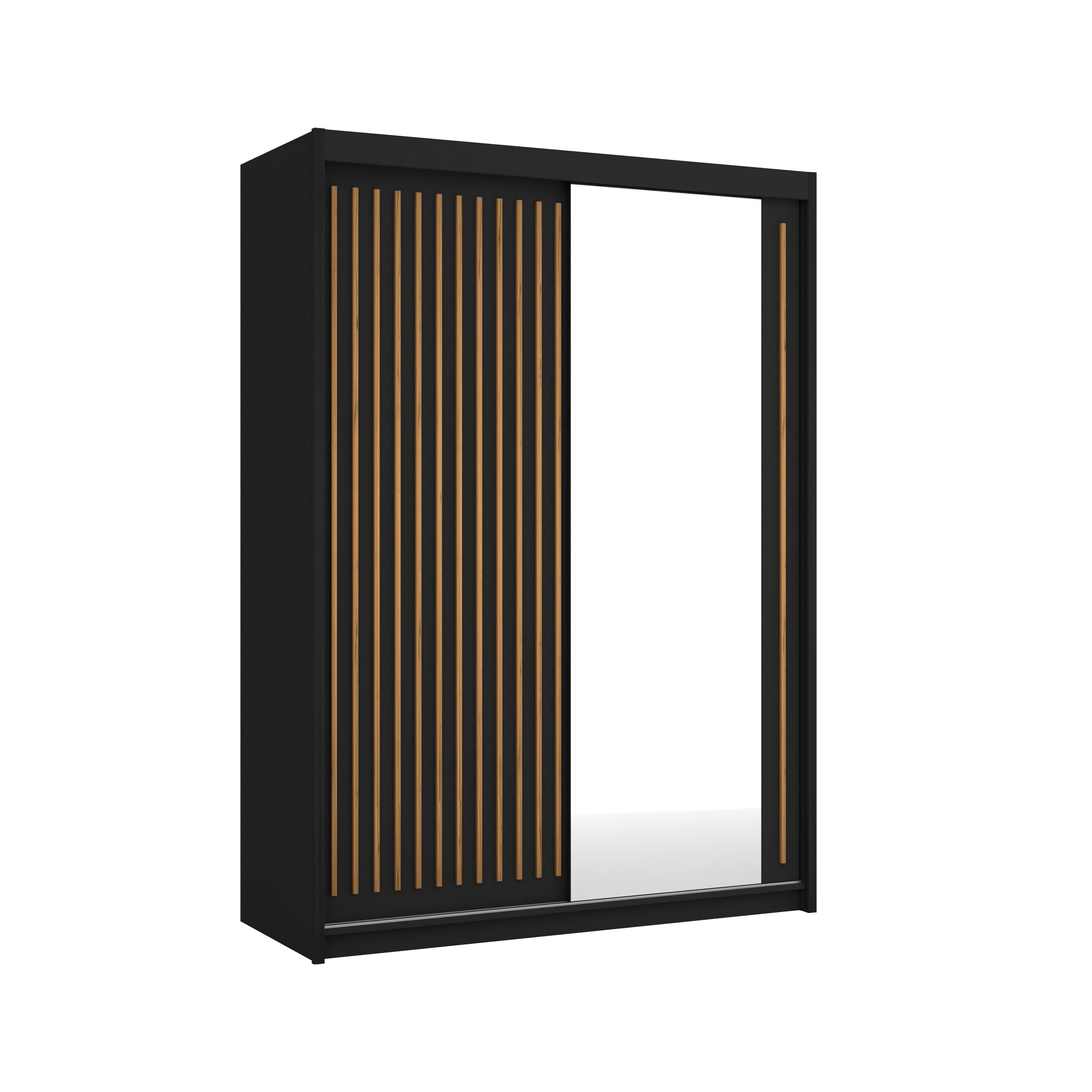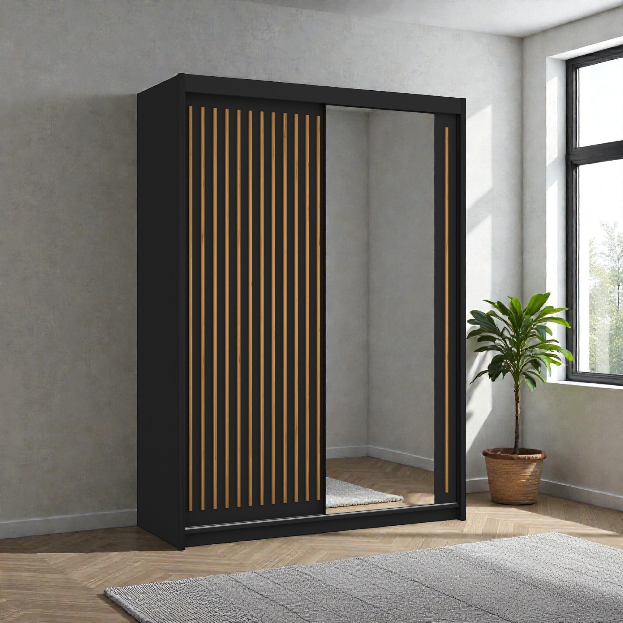 Moderní šatní skřín Flores 150cm, černá + dub wotan + zrcadlo