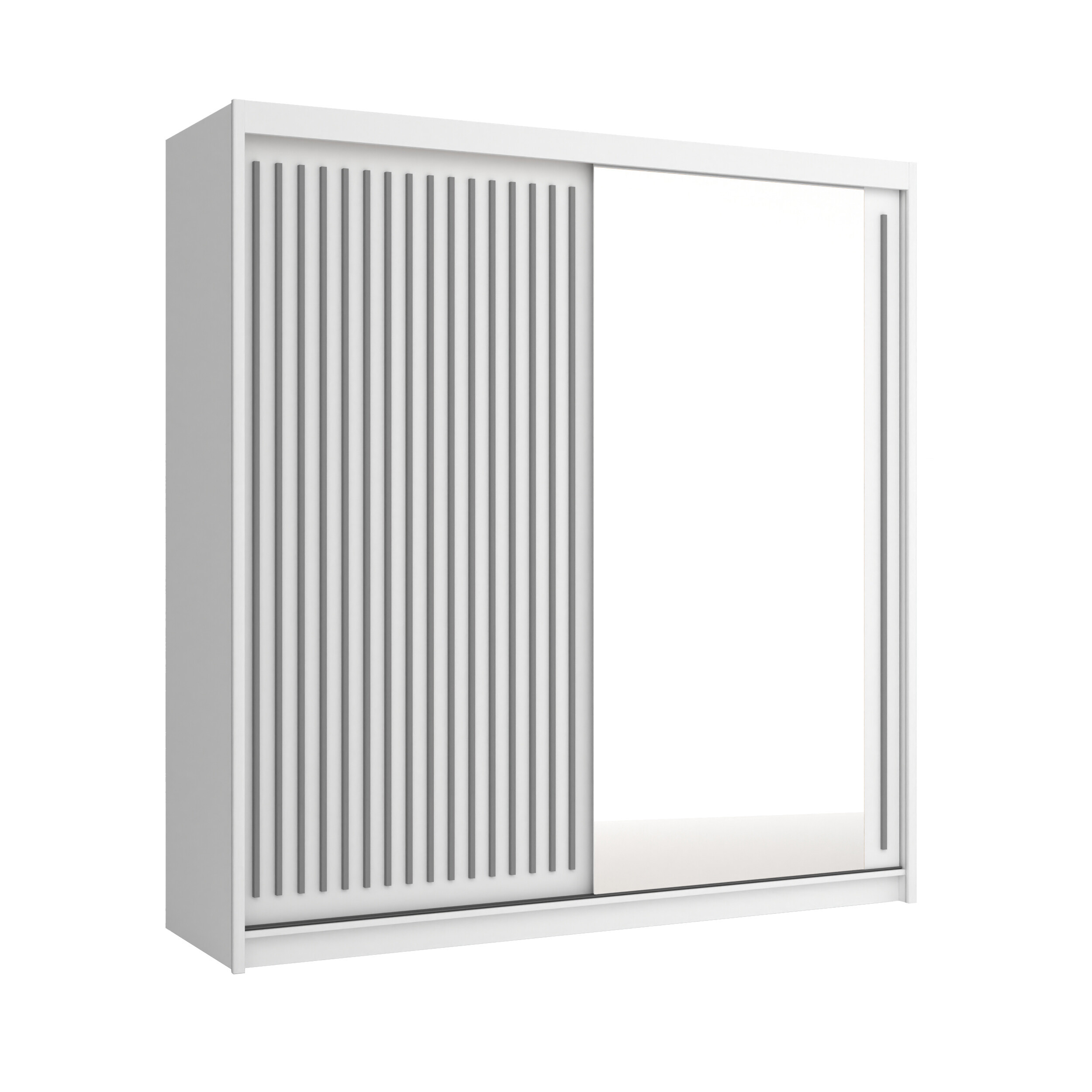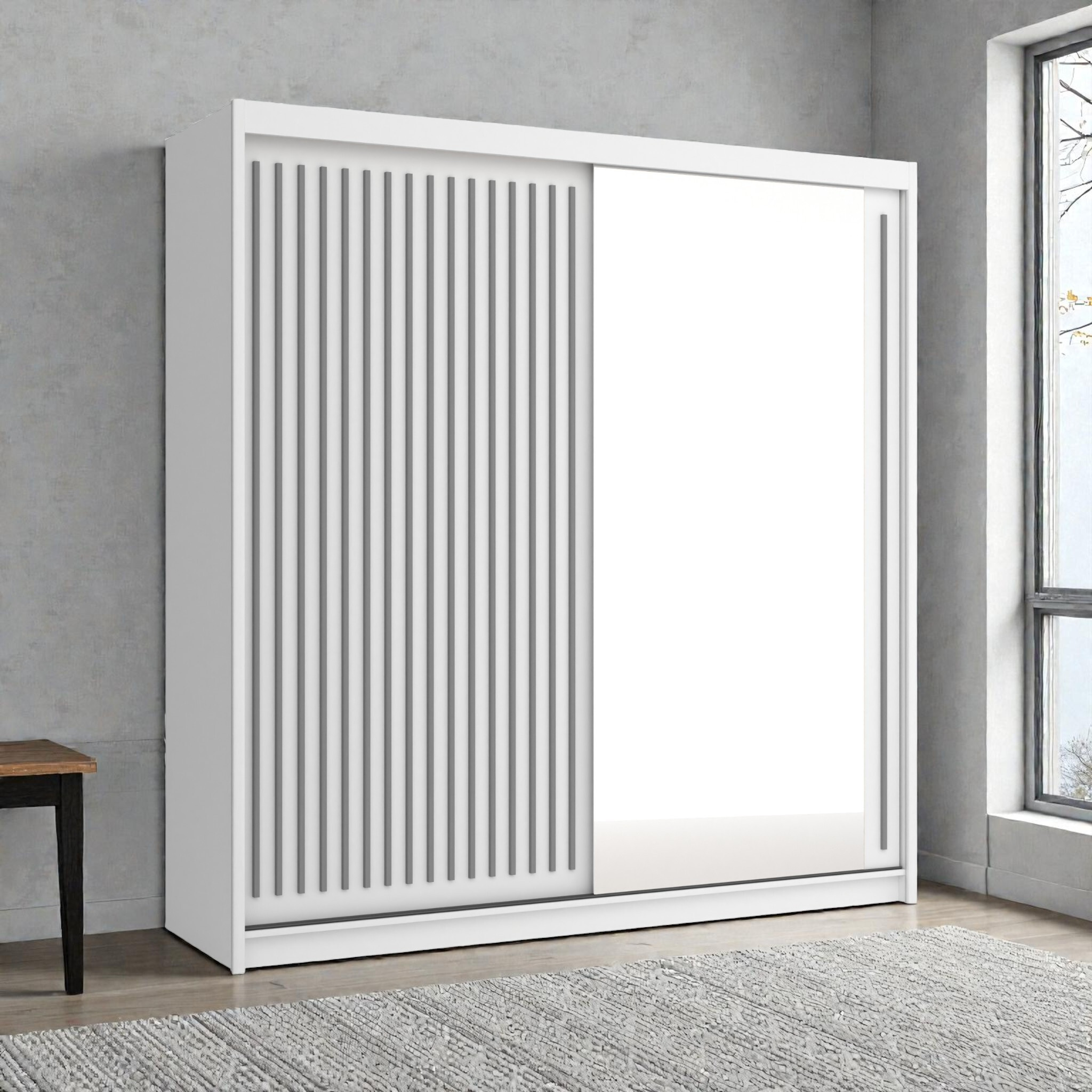 Hledáte dokonalou souhru moderního designu a praktického využití? Tato šatní skříň s dekorativními lamelami a velkým zrcadlem přináší do vašeho domova aktuální interiérové trendy. Díky široké škále barev a třem dostupným šířkám, se tato skříň přizpůsobí každé ložnici, šatně či předsíni.