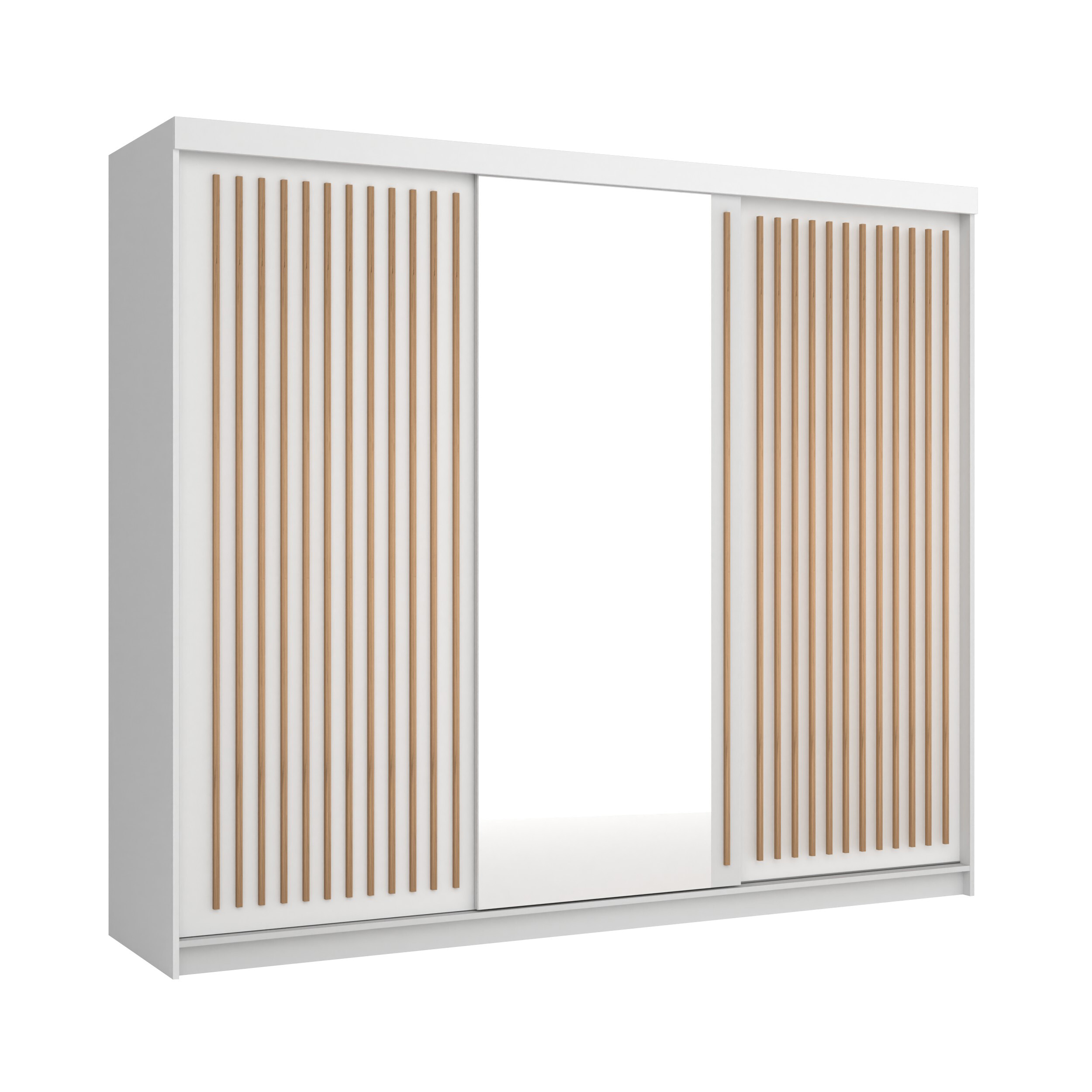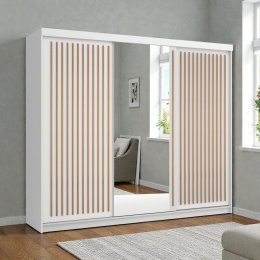 Hledáte dokonalou souhru moderního designu a praktického využití? Tato šatní skříň s dekorativními lamelami a velkým zrcadlem přináší do vašeho domova aktuální interiérové trendy. Díky široké škále barev a třem dostupným šířkám, se tato skříň přizpůsobí každé ložnici, šatně či předsíni.