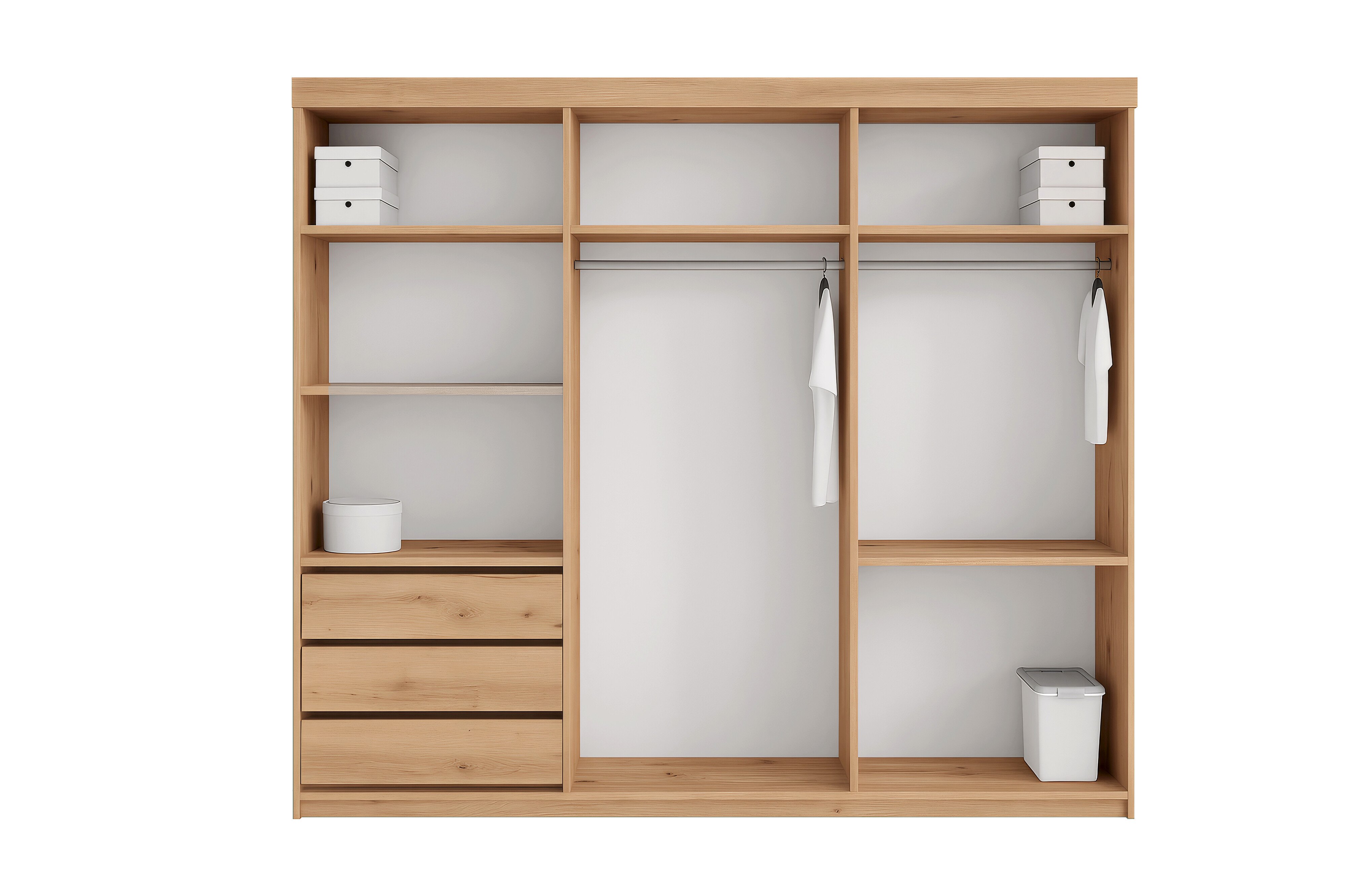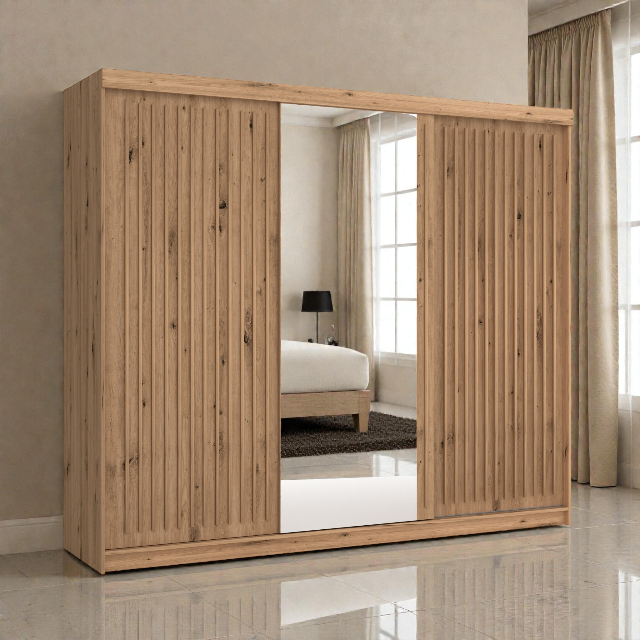 Hledáte dokonalou souhru moderního designu a praktického využití? Tato šatní skříň s dekorativními lamelami a velkým zrcadlem přináší do vašeho domova aktuální interiérové trendy. Díky široké škále barev a třem dostupným šířkám, se tato skříň přizpůsobí každé ložnici, šatně či předsíni.