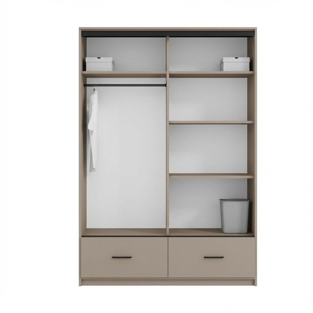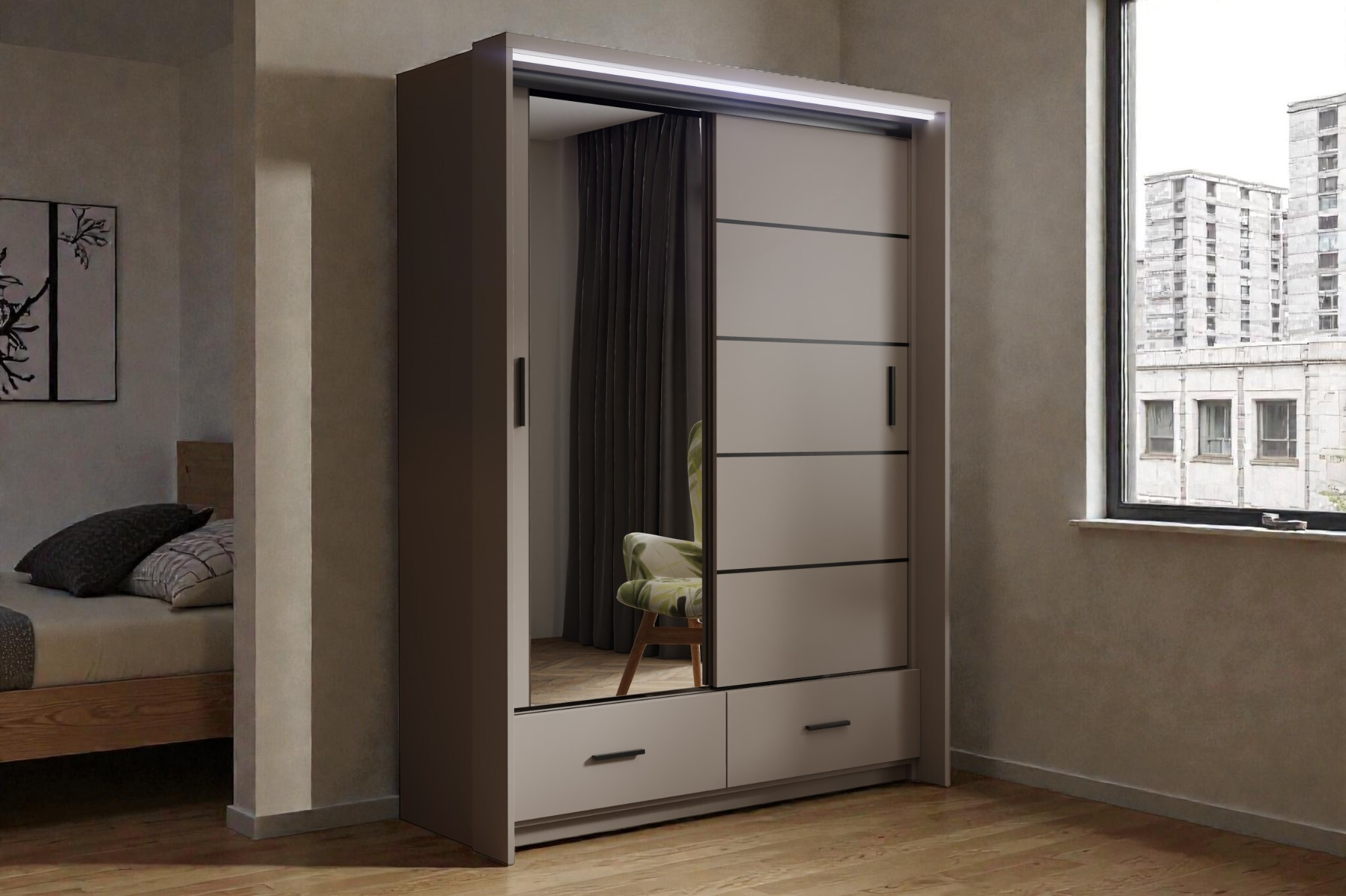 • Praktické šuplíky a zrcadlo: Kombinace posuvných dveří se zrcadlem a integrovaných šuplíků zajišťuje, že pro každou část vašeho oděvu najdete ideální místo.