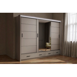 Představujeme vám šatní skříň, která vybočuje z řady. V unikátním a velmi žádaném odstínu jívová (Clay) přináší do interiéru zemité tóny, které působí uklidňujícím a luxusním dojmem. Tato skříň není jen úložným prostorem, ale díky integrovanému LED osvětlení a černé akcentaci se stane stylovým doplňkem vaší moderní domácnosti.