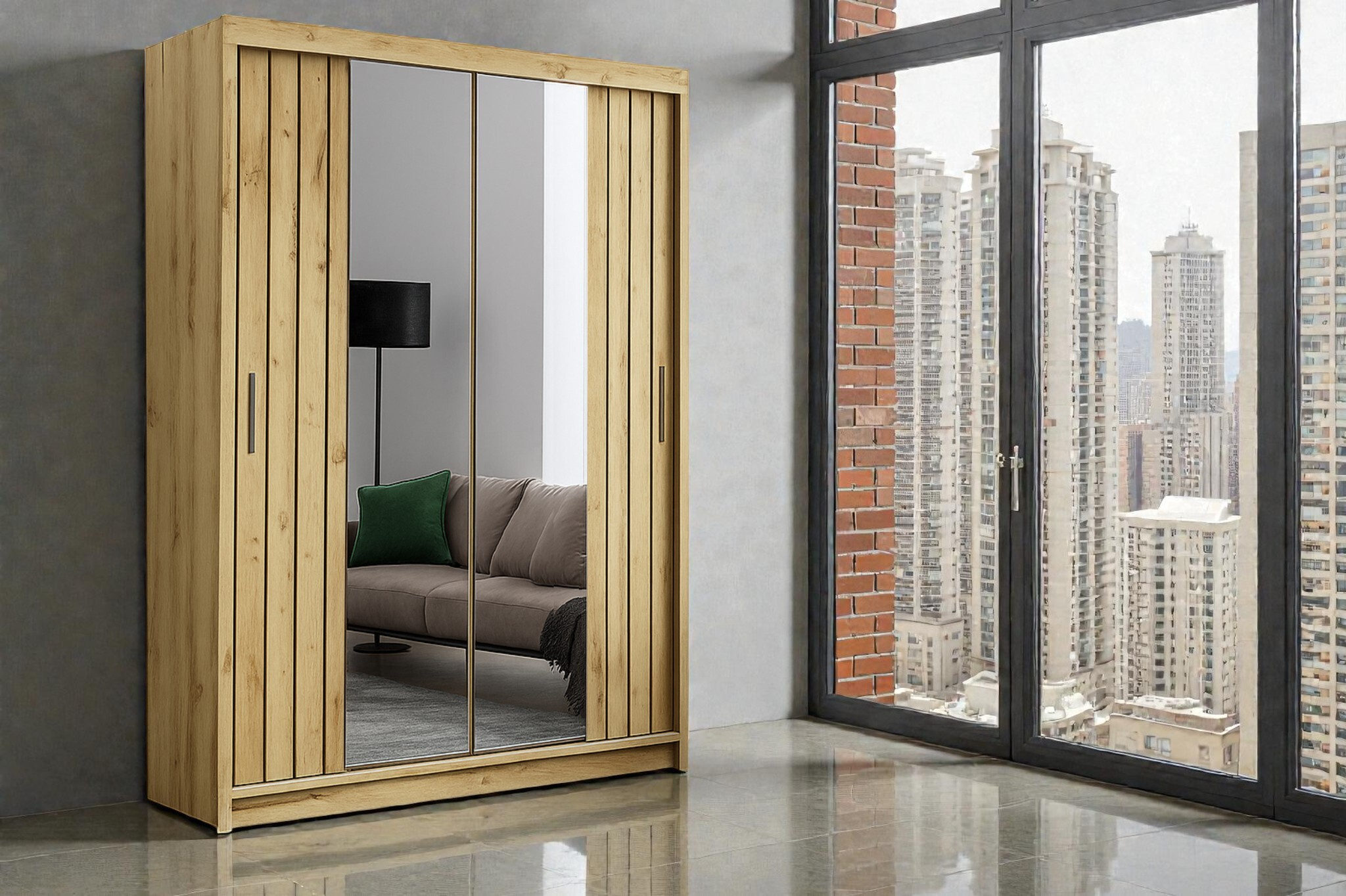 Tato šatní skříň je ideální volbou pro ty, kteří hledají rovnováhu mezi designem a promyšlenou ergonomií. Díky kombinaci prostorných šuplíků, velkého zrcadla a elegantního dekorativního pásu se stane nejen praktickým pomocníkem, ale i stylovým prvkem vaší ložnice nebo předsíně.