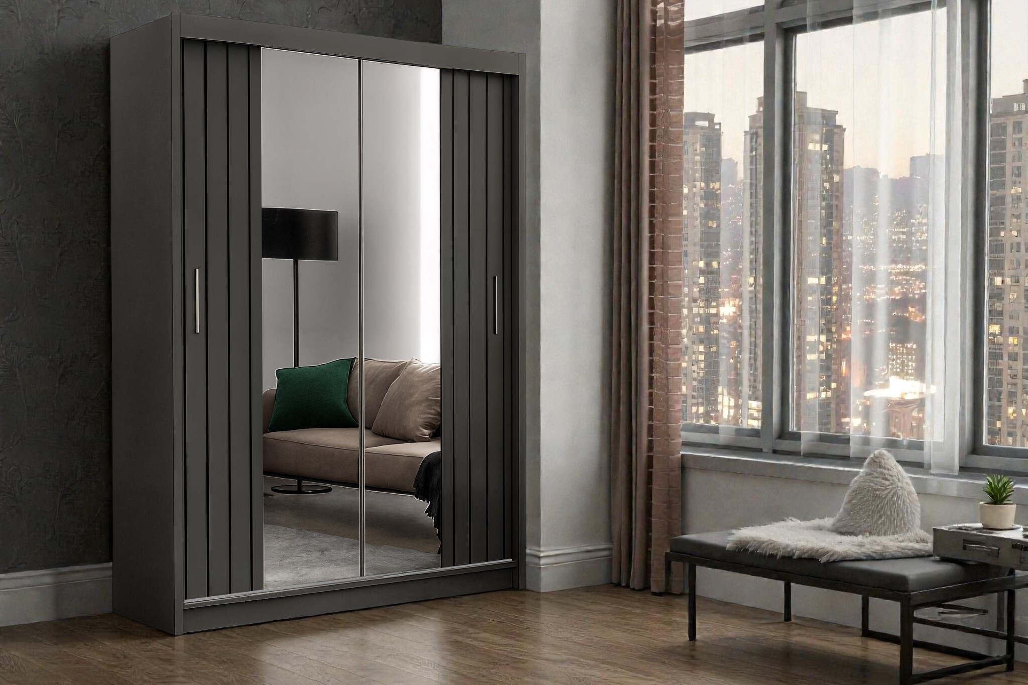 • Velké zrcadlo: Dominantní zrcadlová plocha na posuvných dveřích prosvětlí místnost a opticky ji zdvojnásobí.