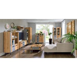 Tato kolekce vyniká odvážným kontrastem struktur. Zatímco dub wotan přináší hřejivou barvu a výraznou kresbu dřeva, betonové detaily dodávají nábytku moderní, „loftový“ vzhled.
