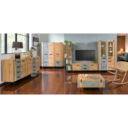 Tato kolekce vyniká odvážným kontrastem struktur. Zatímco dub wotan přináší hřejivou barvu a výraznou kresbu dřeva, betonové detaily dodávají nábytku moderní, „loftový“ vzhled.