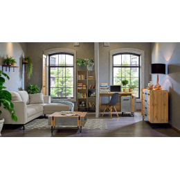 Tato kolekce vyniká odvážným kontrastem struktur. Zatímco dub wotan přináší hřejivou barvu a výraznou kresbu dřeva, betonové detaily dodávají nábytku moderní, „loftový“ vzhled.