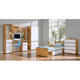 Sestava A zahrnuje elementy: regál 3 + pc stůl + police 12 + regál 11 + skřín 1 + postel + komoda 5