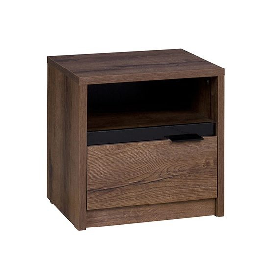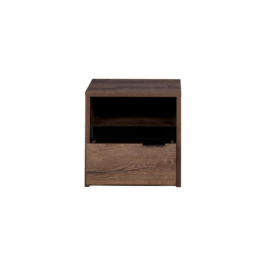 Noční stolek DEVON kombinuje elegantní design s praktickou funkčností a je ideálním doplňkem vaší ložnice. Kombinace klášterního dubu a černého vysoce lesklého povrchu dodává tomuto kusu nábytku moderní a stylový vzhled, zatímco lesklé vložky dodávají jemné akcenty. Za dvířky se skrývá dostatek úložného prostoru pro knihy, noční stolky nebo osobní věci. Kovové úchytky umožňují pohodlné otevírání a ABS hrany poskytují odolnou ochranu proti poškrábání. Jedna dvířka: Nabízí praktický úložný prostor pro drobnosti. Moderní design: Harmonická kombinace vzhledu dřeva a vysokého lesku. Vysoce kvalitní zpracování: ABS hrany chrání před opotřebením a poškrábáním. Pohodlné kovové úchytky: Snadné a tiché otevírání. Všestranné použití: Ideální jako noční stolek v ložnici nebo jako odkládací stolek. Noční stolek DEVON zaujme svým promyšleným designem, vysoce kvalitními materiály a funkčností. Vnese do vaší ložnice pořádek a dodá stylové akcenty.