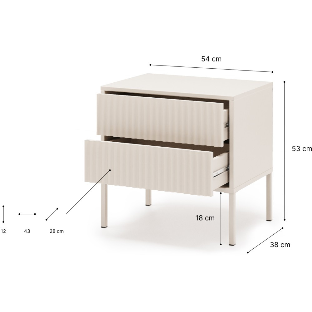 Noční stolek NOTO se 2 zásuvkami a drážkovanými čely kombinuje elegantní design s vysokou funkčností a je perfektním doplňkem každé ložnice. Stylové, drážkované kašmírové čely dodávají moderní nádech, zatímco dvě praktické zásuvky nabízejí dostatek prostoru pro osobní věci. Drážkované kašmírové čely – vytvářejí nadčasový, elegantní vzhled a harmonicky zapadají do vaší ložnice. Dvě prostorné zásuvky – ideální pro budíky, knihy, brýle nebo jiné osobní předměty, dobře uspořádané a snadno dostupné. Pevný korpus z 18mm dřevotřísky Kronospan – odolný, robustní a snadno se čistí. Čela z MDF – rozměrově stabilní a s vysoce kvalitní povrchovou úpravou. Zadní panel z HDF – zpevňuje konstrukci a poskytuje dodatečnou stabilitu. Nohy z MDF a kovu – zajišťují bezpečné postavení a zdůrazňují moderní design. Kompaktní rozměry: 54 x 38 x 53 cm – hodí se stejně dobře do malých i velkých ložnic a nabízí praktický úložný prostor. Úložný prostor.