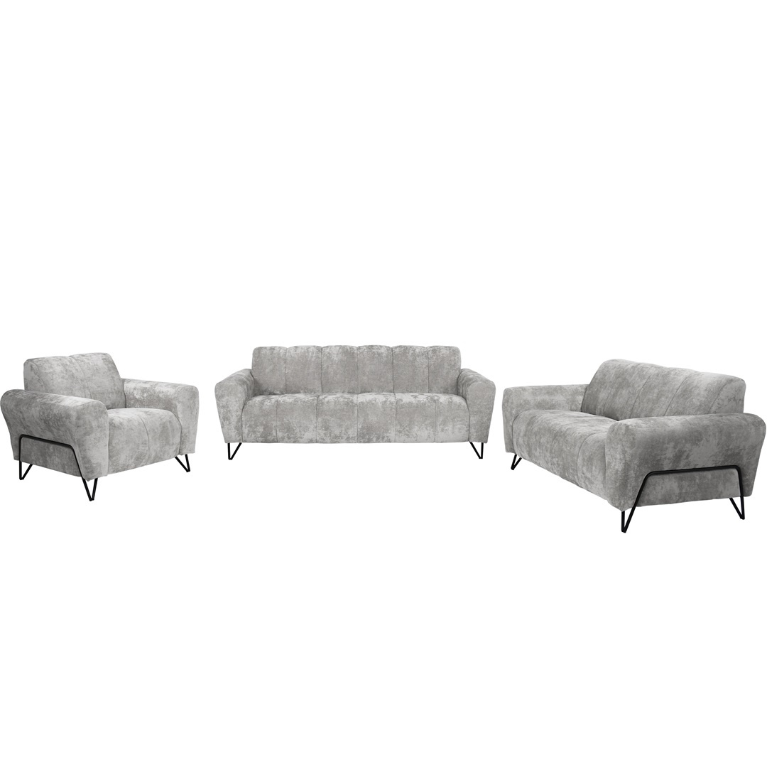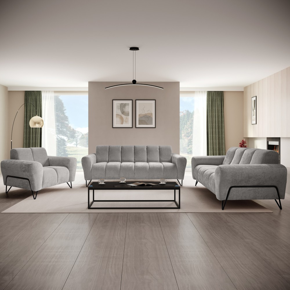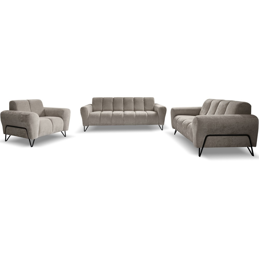Sada čalounění VOLARE spojuje moderní design s vysokou funkčností a je ideální volbou pro stylové obytné prostory. Kombinace 3místné pohovky, 2místné pohovky a pohodlného křesla poskytuje dostatek prostoru pro vaši rodinu a hosty. Dekorativní černé kovové nohy dodávají nábytku elegantní nádech a zároveň zajišťují stabilitu.