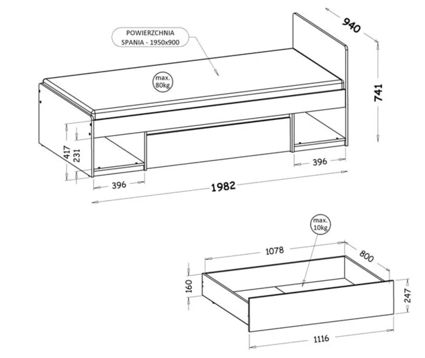 Ložná plocha: 195x90cm