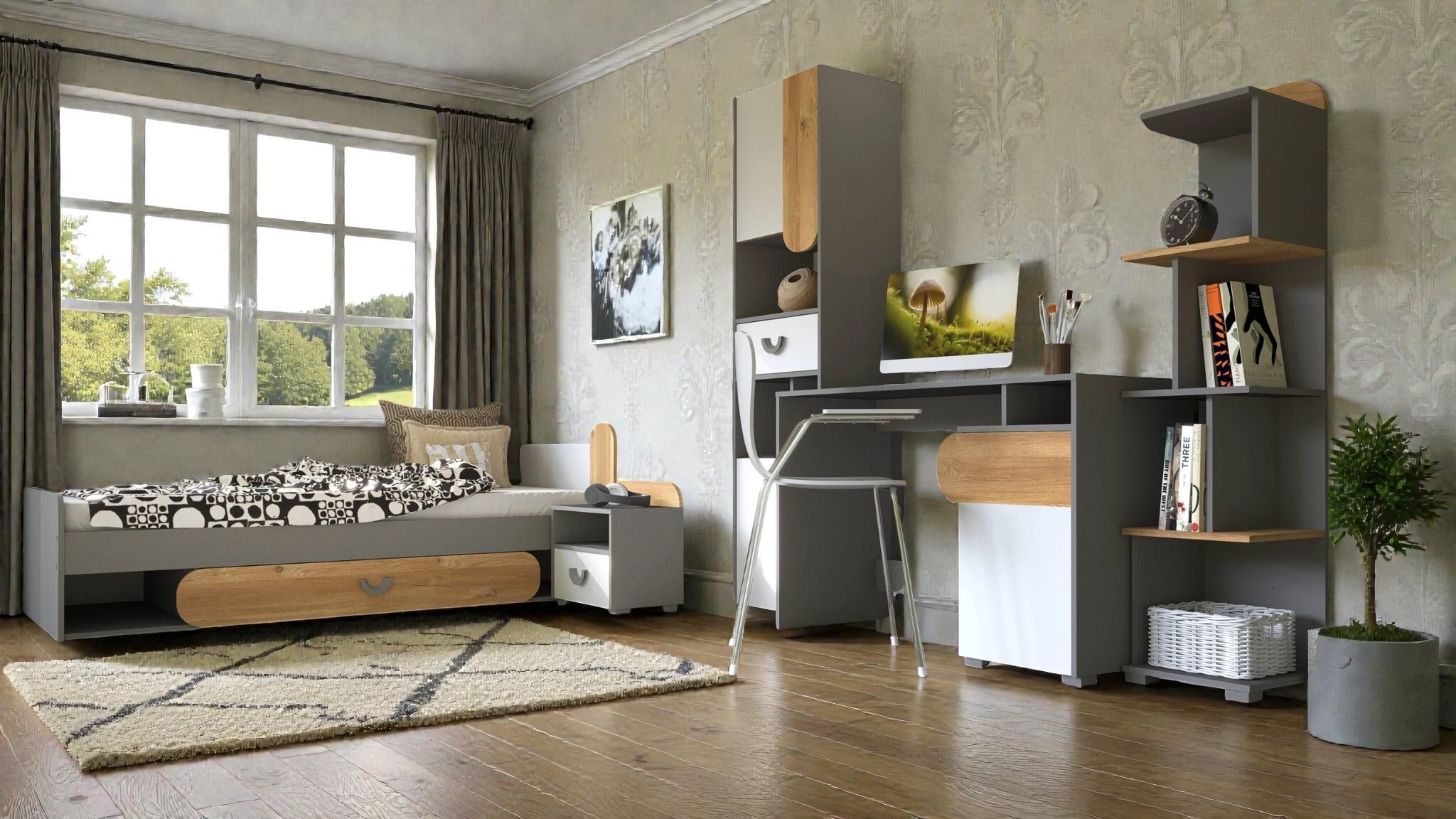 Vytvořte prostor, kde se učení stává radostí a odpočinek zaslouženým relaxem. Naše nová kolekce nábytku pro studenty a mladé dospělé spojuje industriální nádech dubu Riva s luxusním bílým leskem, který opticky zvětší a rozzáří i menší pokoje.