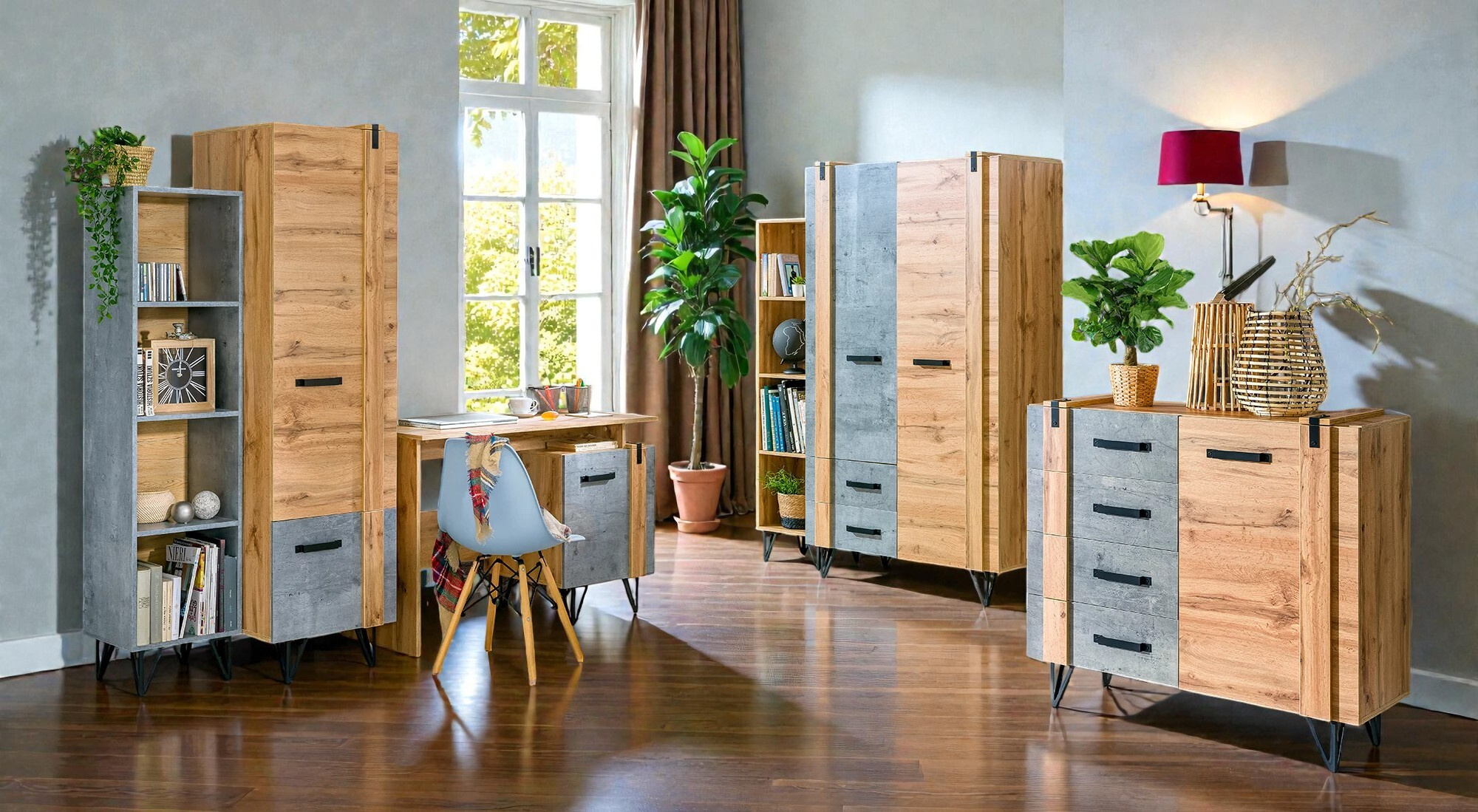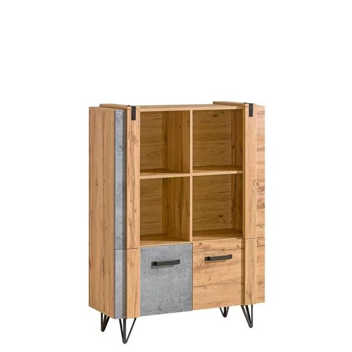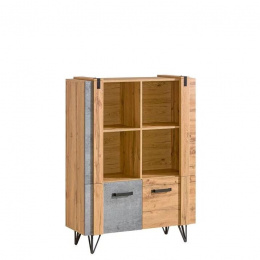 Tato kolekce vyniká odvážným kontrastem struktur. Zatímco dub wotan přináší hřejivou barvu a výraznou kresbu dřeva, betonové detaily dodávají nábytku moderní, „loftový“ vzhled.