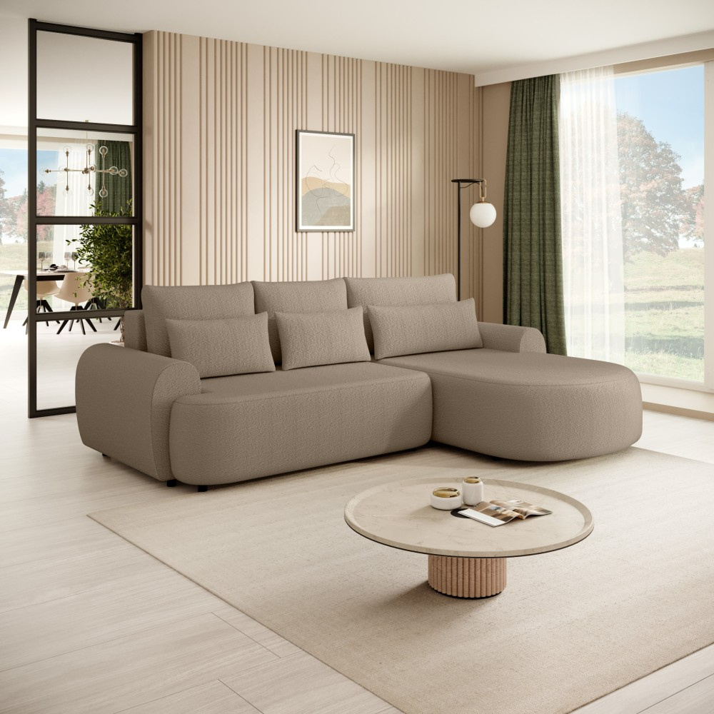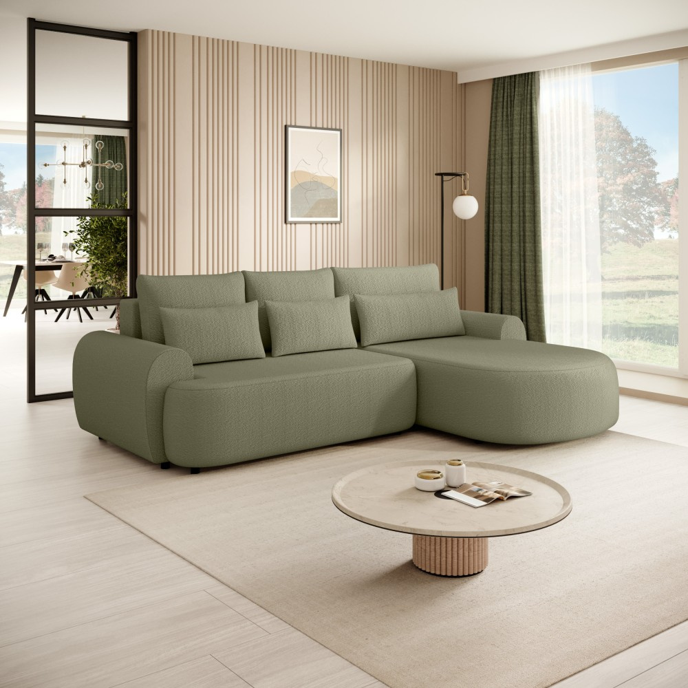 Tato rohová pohovka Olivio z buklé látky je ideální pro všechny, kteří oceňují styl a funkčnost. Je to kus nábytku, který nejen krásně vypadá, ale také nabízí mnoho možností. Díky zaoblené otomance můžete snadno přetvořit svůj prostor a přizpůsobit roh svým potřebám. Kromě toho má funkci spánku, což z něj činí ideální místo k odpočinku, a to i pro hosty. A pokud potřebujete další prostor pro své ložní prádlo, už si nemusíte dělat starosti - roh je vybaven úložným prostorem, ve kterém můžete uložit ložní prádlo a další doplňky. Dostupné v různých barvách, každý si najde to pravé pro sebe. Pokud hledáte něco mimořádně stylového a praktického pro váš obývací pokoj, je tato rohová pohovka tou nejlepší volbou.