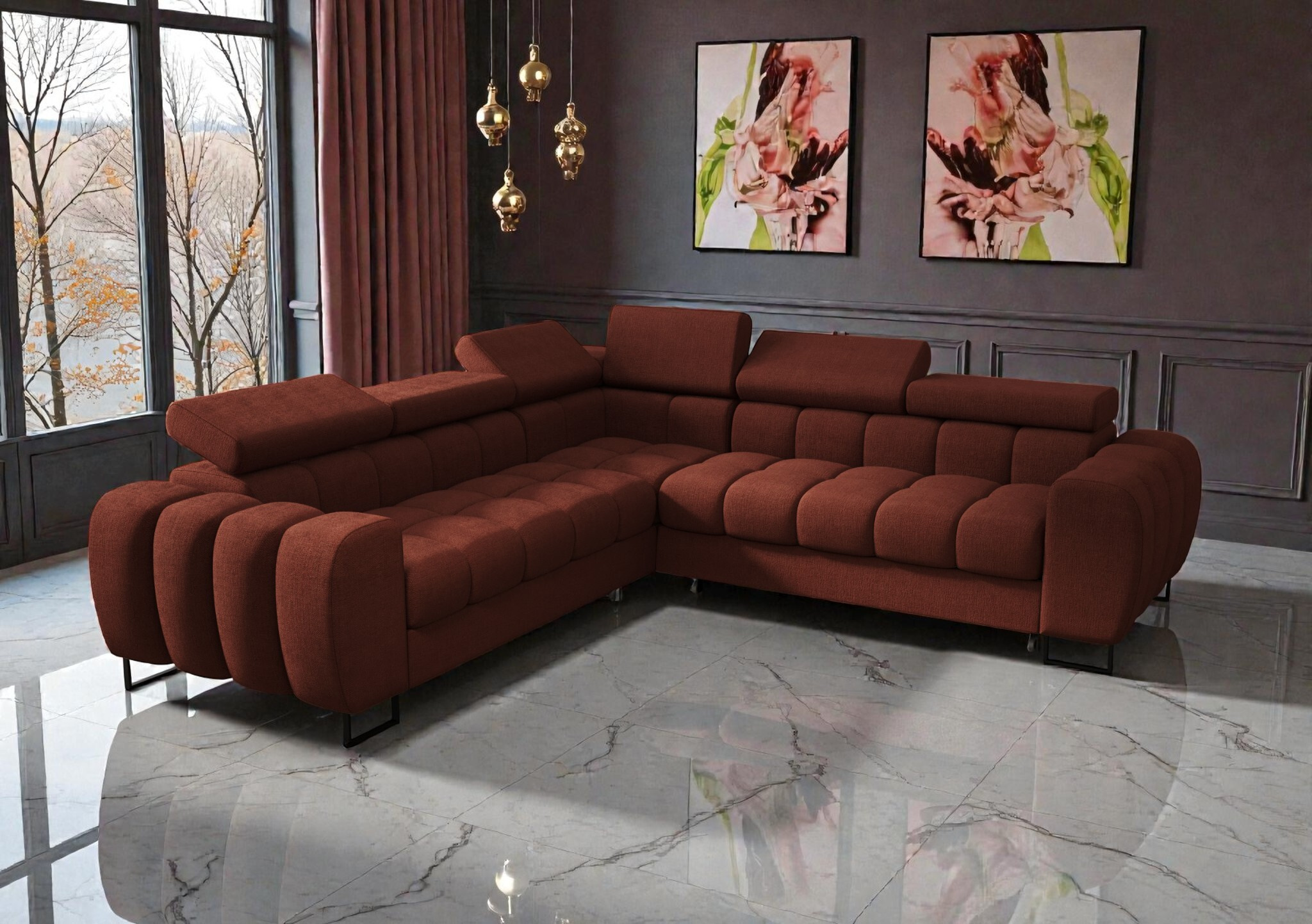 Představujeme vám model Diana Max, "většího bratra" naší klasické řady Diana. Na rozdíl od běžných souprav je tento model rovnoboký a plně symetrický, což z něj dělá ideální dominantu do rohu místnosti i do volného prostoru. I přes svou symetrii si však zachovává praktičnost – orientaci (levou nebo pravou) určujeme podle umístění úložného prostoru na lůžkoviny.