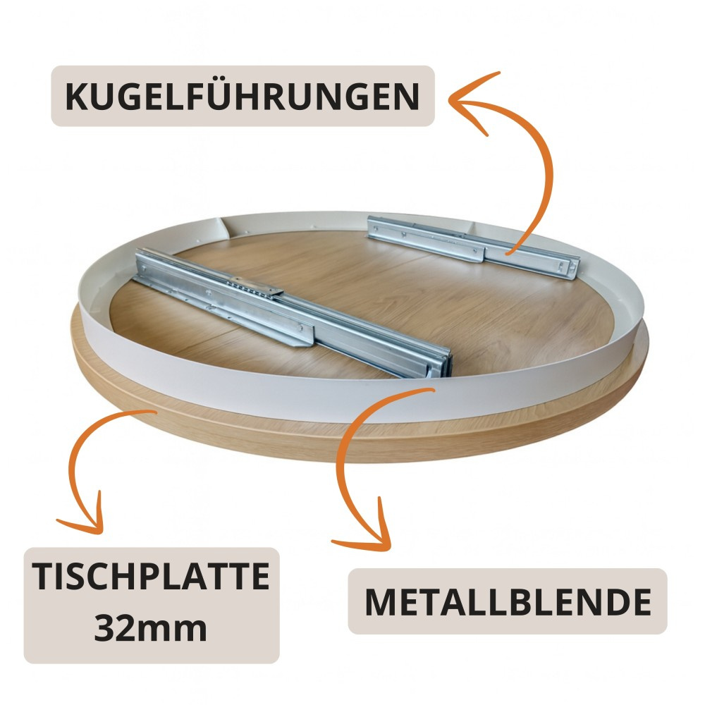 Funkce rozšíření je obzvláště praktická: S pomocí robustních kuličkových ložisek lze stůl během chvilky roztáhnout na šířku 180 cm – ideální pro rodinná setkání nebo příjemné večery s přáteli. Součástí dodávky jsou dvě prodlužovací desky. 40 cm, kterou lze flexibilně využít.