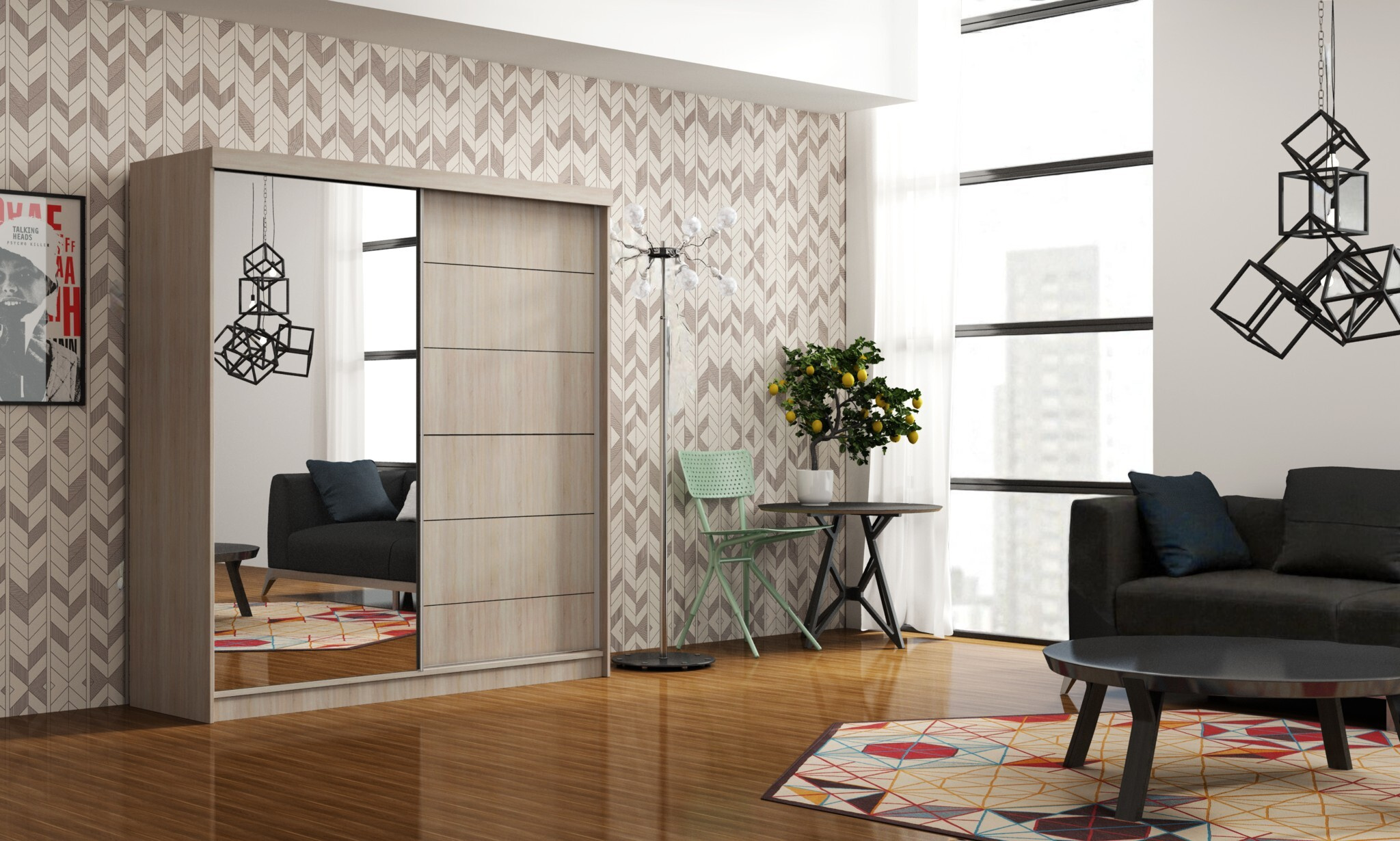 Moderní šatní skříň se zrcadlem a dekorativními detaily