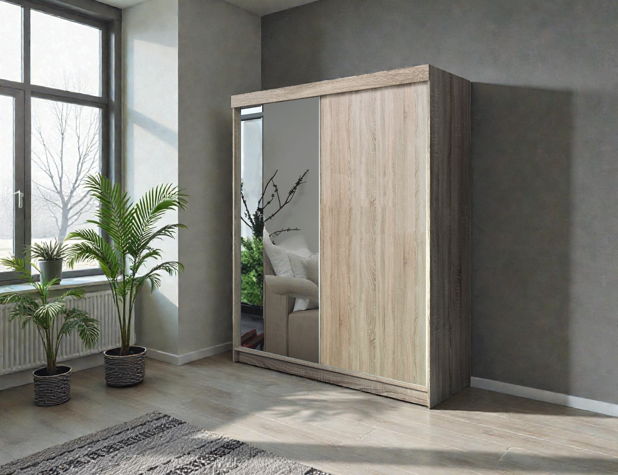 Hledáte spolehlivou šatní skříň, která se snadno kombinuje s ostatním nábytkem a opticky nezatěžuje prostor? Tento model o šířce 150 cm představuje ideální volbu do ložnic, studentských pokojů i předsíní. Čisté linie, posuvný systém otevírání a velká zrcadlová plocha tvoří celek, který je stejně praktický jako estetický.