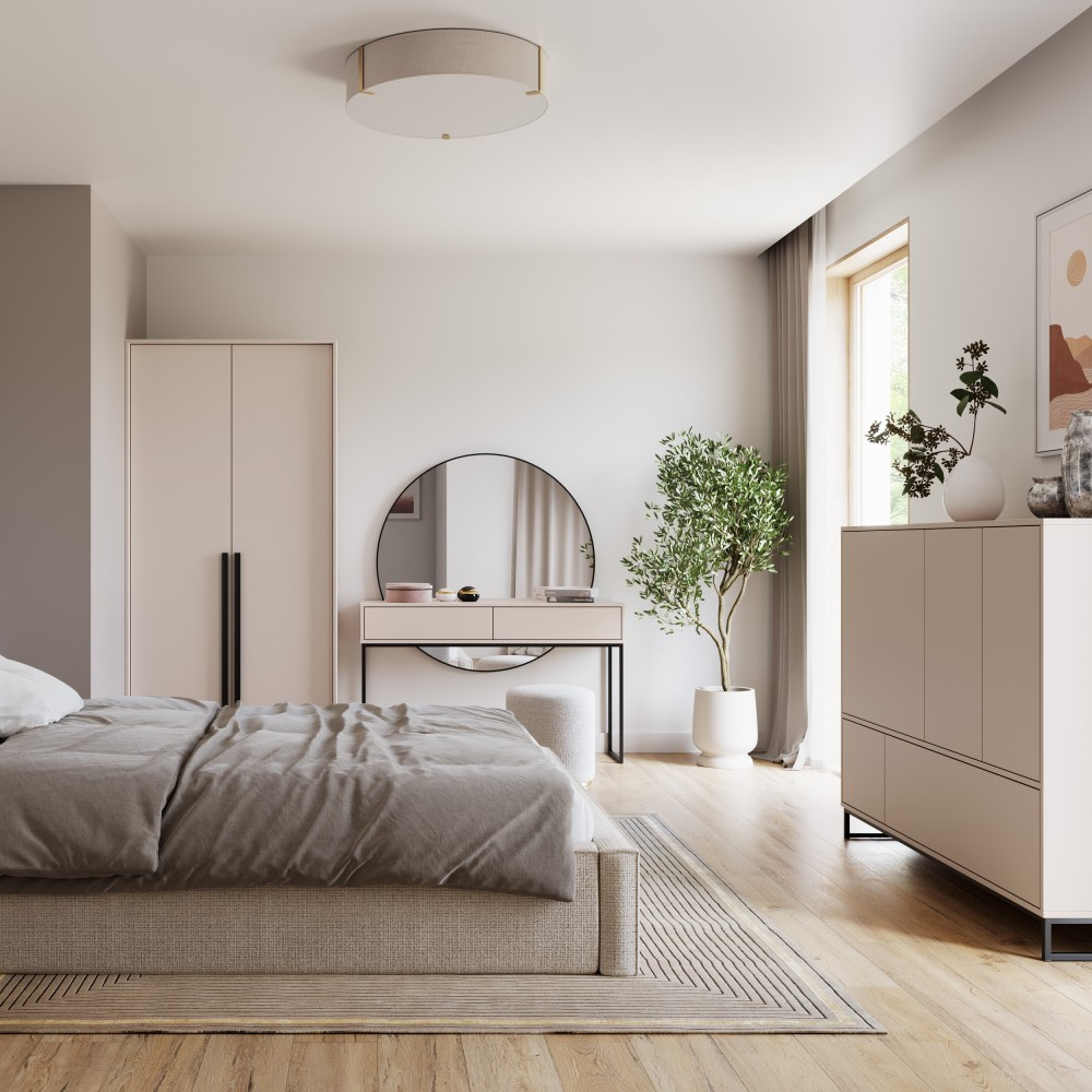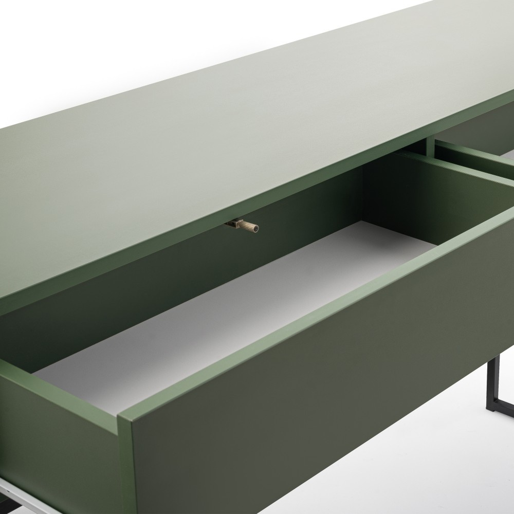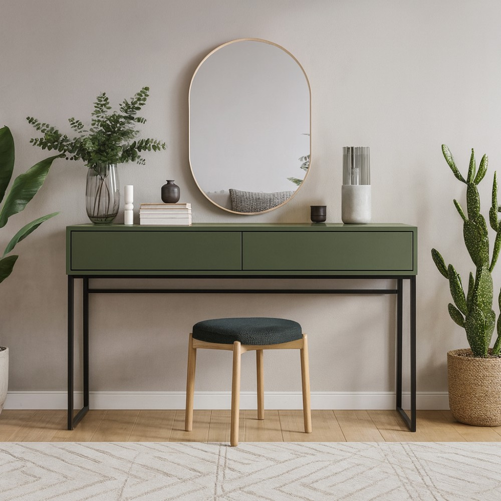 Toaletní stolek GIANA kombinuje moderní design s praktickým každodenním využitím. Díky elegantnímu barevnému provedení v pískově béžové a lahvově zelené vnese do vaší ložnice nebo šatny stylový nádech. Jeho čisté linie a design bez úchytek podtrhují minimalistickou eleganci tohoto kusu nábytku.