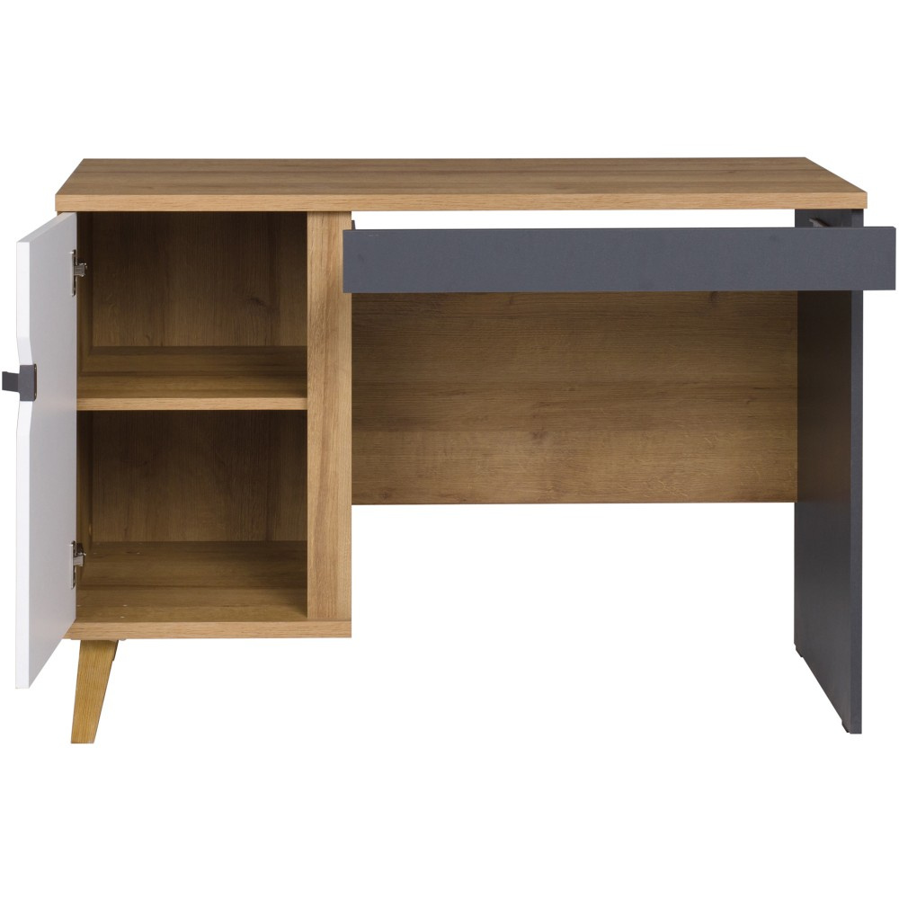 Psací stůl Moreno kombinuje moderní design, funkčnost a odolnost – ideální do pokojů pro teenagery, domácích kanceláří nebo stylových pracovních prostor. Díky harmonickému barevnému schématu a praktickému uspořádání vytváří příjemné a organizované pracovní prostředí. Praktický úložný prostor: Dvířka s policí nabízejí prostor pro knihy, sešity nebo kancelářské potřeby – vše snadno dostupné a úhledně uložené. Robustní konstrukce: Vysoce kvalitní ABS hrany chrání povrchy před nárazy a vlhkostí. Stabilní konstrukce: Plastové nožičky zajišťují bezpečné postavení a usnadňují čištění pod stolem. Pohodlné ovládání: Kovové rukojeti umožňují snadné otevírání a zavírání dvířek. Nadčasový design: Stylová kombinace zlatého dubu, matně bílé a grafitu dodává stolu moderní a hřejivý charakter, který se ideální do každé místnosti. hodí se do každé kanceláře teenagera nebo domácí kanceláře.