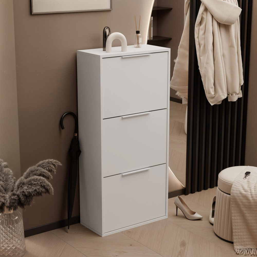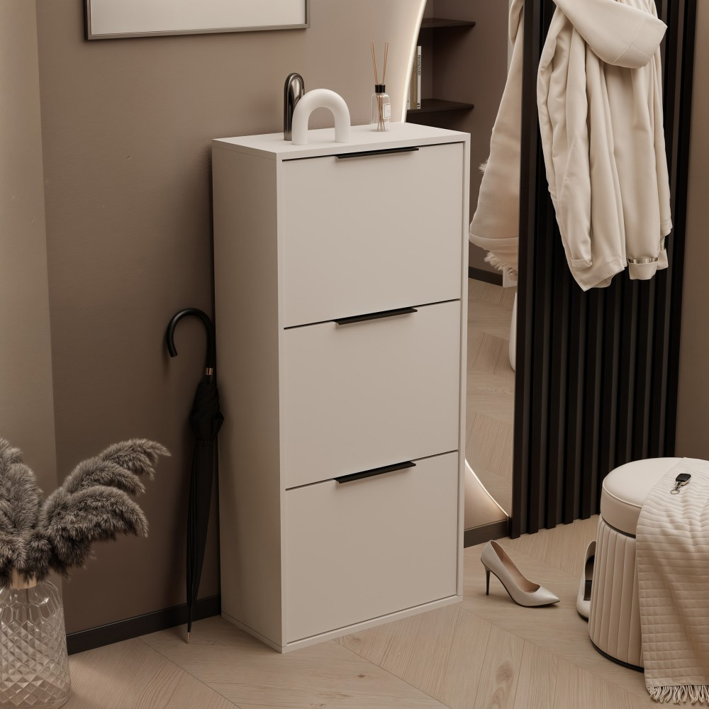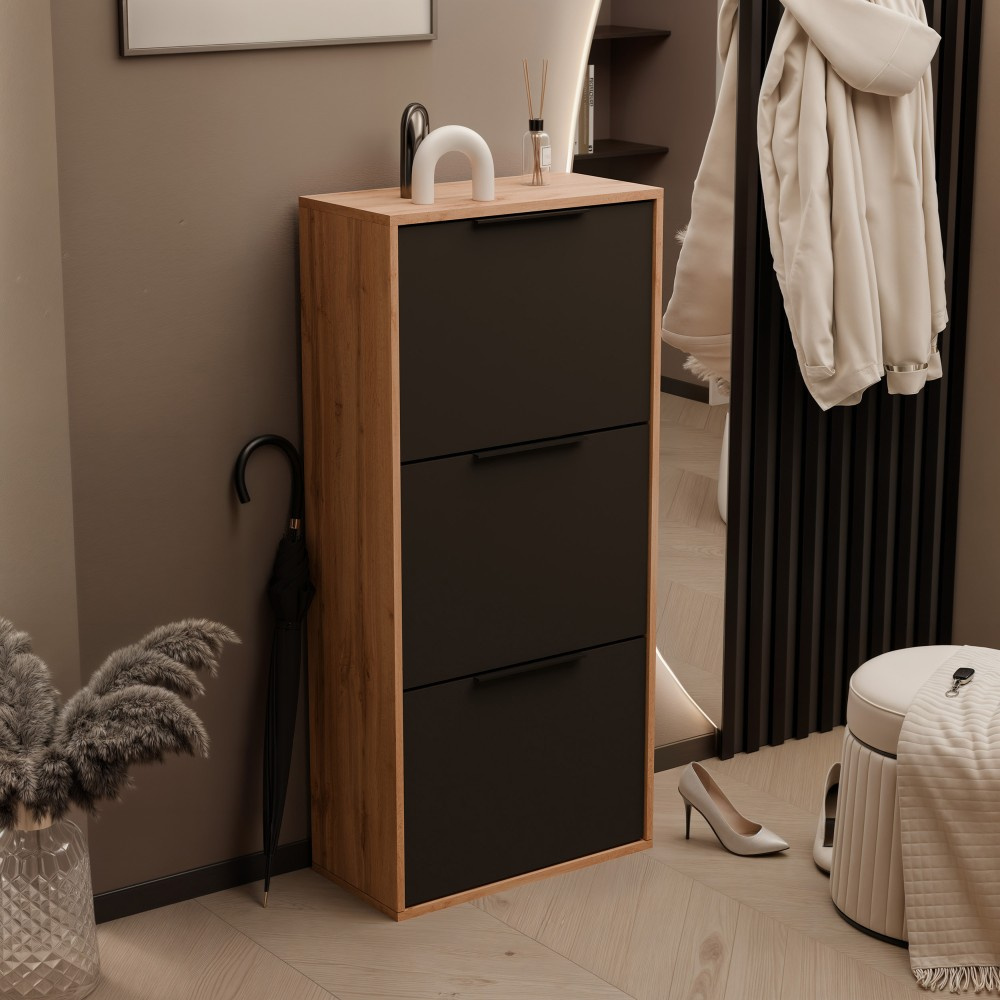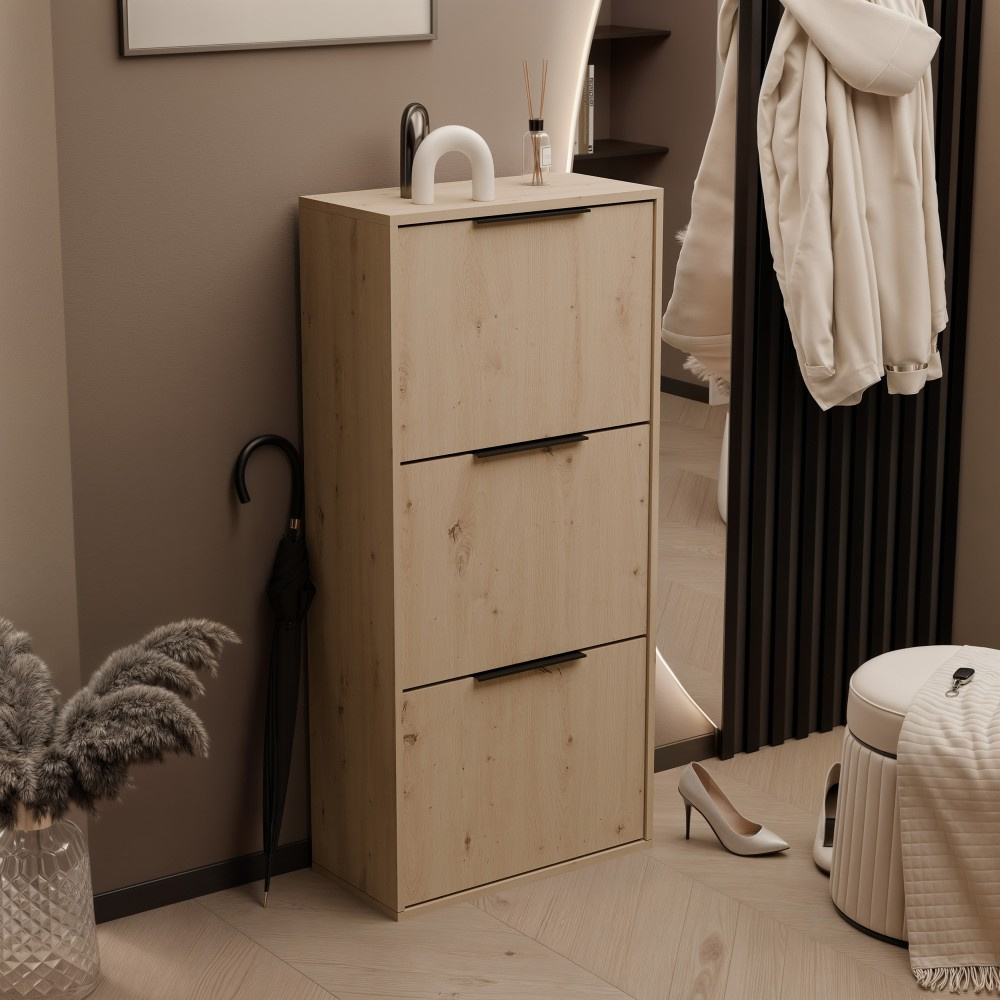 Bootník MUNO se 3 dveřmi je ideálním řešením pro každého, kdo potřebuje více místa na boty, aniž by obětoval elegantní vzhled. Díky štíhlému designu se perfektně hodí do chodeb, šaten nebo šaten a zajistí pořádek a přehlednost. 3 dveře - Nabízí dostatek úložného prostoru pro mnoho párů bot. Přihrádky umožňují organizované a bezprašné uložení. Robustní kovové rukojeti - Moderní, odolné a pohodlné – podtrhují vysoce kvalitní charakter tohoto kusu nábytku. Vyrobeno z robustní laminátové desky - Snadno se čistí, je odolné a ideální pro každodenní použití. Perfektně se hodí do prostor s vysokou frekvencí pohybu, jako je vstupní hala. Možnosti barev - Botník je k dispozici ve čtyřech stylových barvách: Bílá – nadčasová a vhodná do jakéhokoli interiéru, Pískově béžová – jemná a elegantní, Dub Artisan – moderní, přírodní a teplá, Dub Wotan + Černá – trendy a osobitá. Prostorově úsporný design - Navzdory své výšce zůstává skříňka štíhlá a nenápadná, ideální do úzkých chodeb.