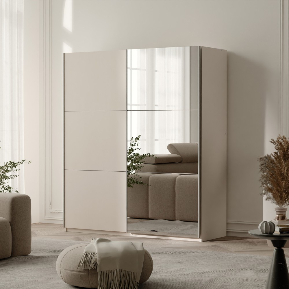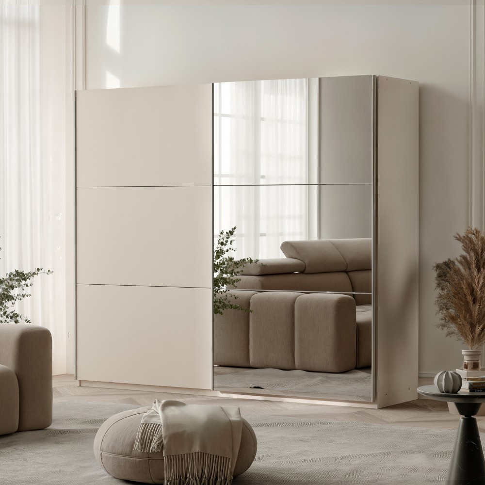 Šatní skříň VISTO s posuvnými dveřmi zaujme svými čistými liniemi, moderním barevným schématem a dobře navrženým vnitřním uspořádáním. Díky své elegantní pískově béžové barvě harmonicky zapadá do široké škály stylů interiérového designu a díky zrcadlové přední straně vytváří světlejší a opticky větší místnost. 2 šatní věšáky - Ideální pro úhledné zavěšení bund, košil, šatů nebo halenek. 4 prostorné police - Ideální pro složené oblečení, doplňky, ložní prádlo nebo úložné krabice. Velké zrcadlo vpředu - Praktické pro každodenní oblékání a také opticky zvětšuje místnost. Barva: Pískově béžová - Teplý, neutrální odstín, který vytváří moderní a útulnou atmosféru. [viditelnost obsahu:auto] podporuje [viditelnost obsahu:auto]:[obsahuje-intrinsic-size:auto_100lvh] scroll-mt-[calc(var(--header-height)+min(200px,max(70px,20svh)))]" dir="auto" tabindex="-1" data-turn-id="18148a19-c086-45d6-9999-632f690253b6" data-testid="konverzace-998" data-scroll-anchor="true" data-turn="asistent">