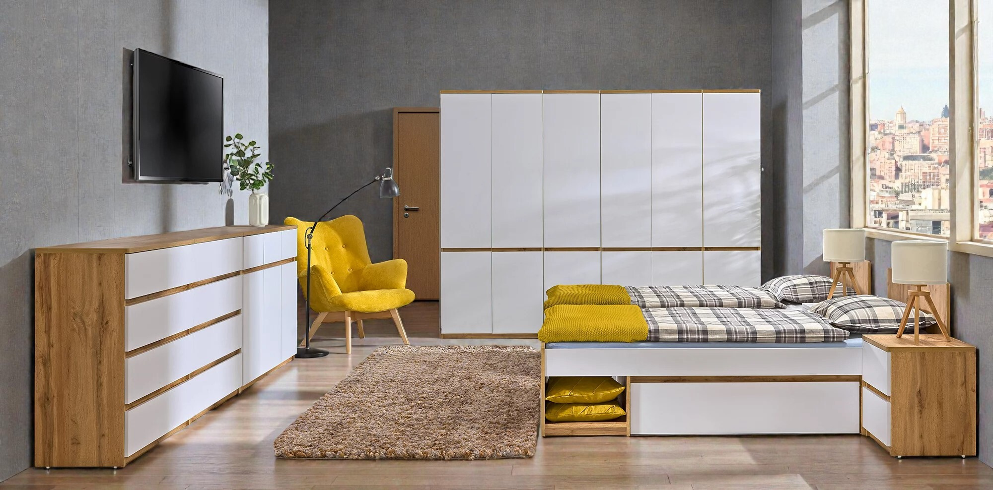 Tato kolekce je navržena s ohledem na detail a dlouhou životnost. Kontrastní kombinace korpusu a čelních ploch dodá vašemu obývacímu pokoji nebo ložnici moderní skandinávský nádech.