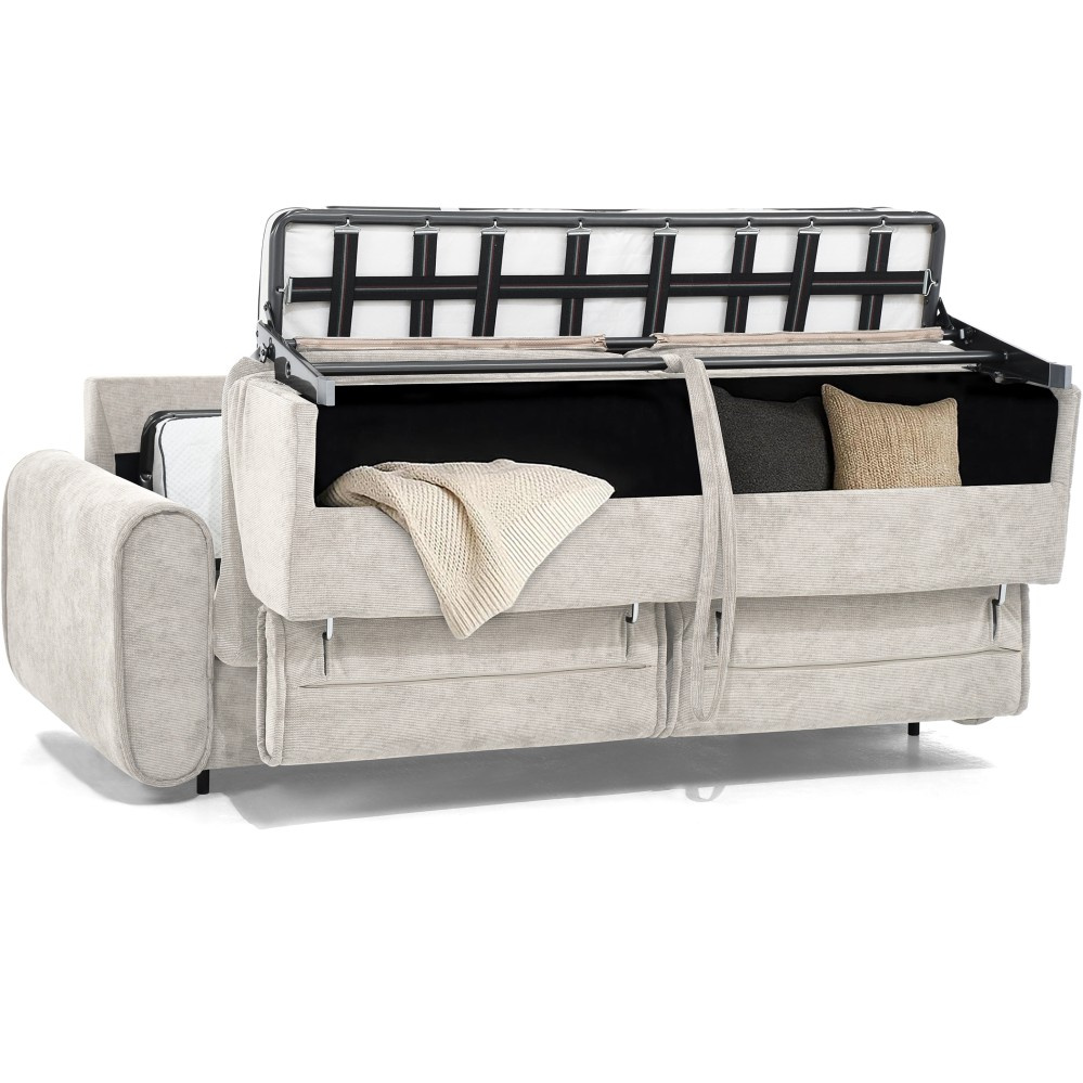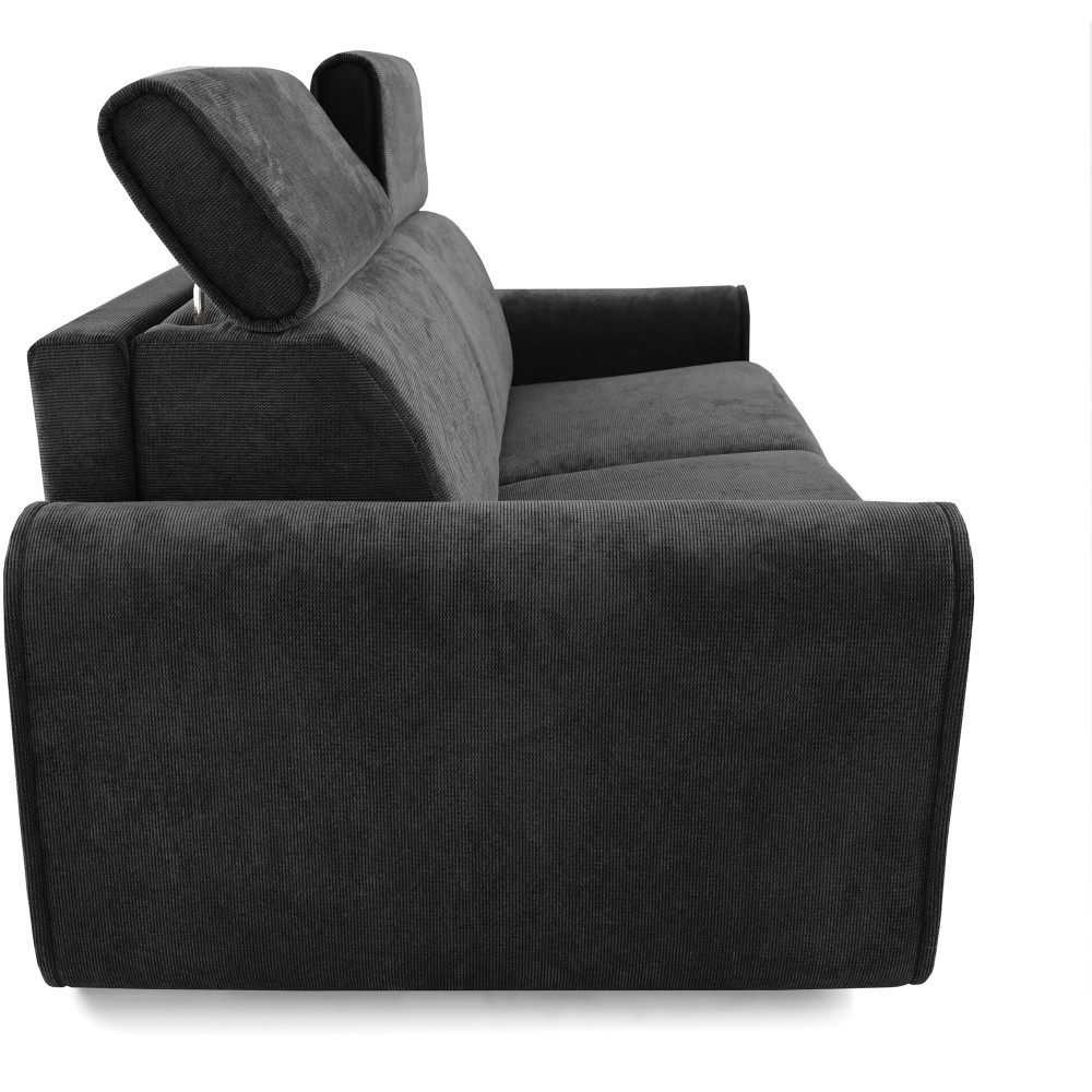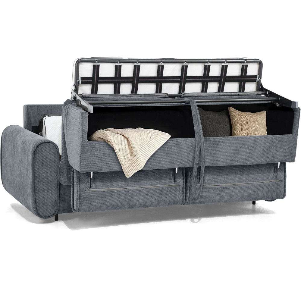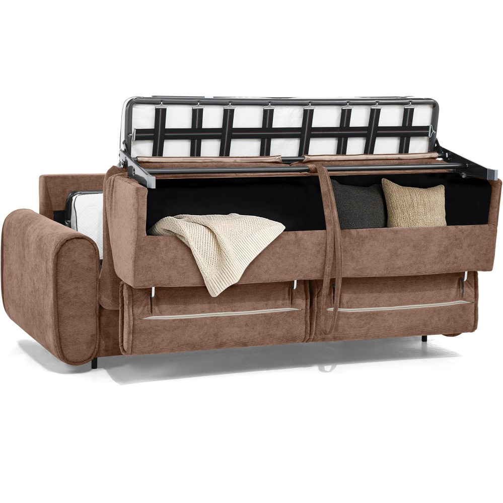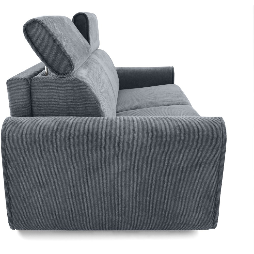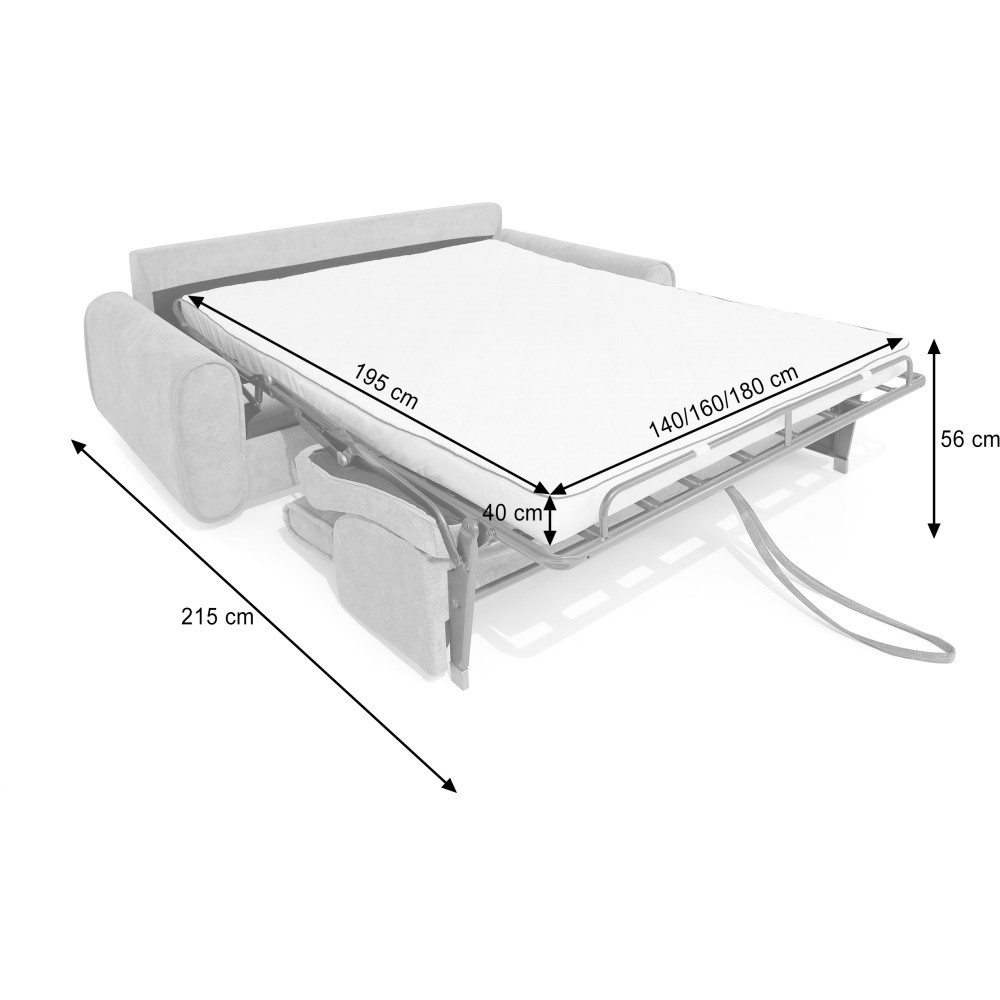 Pohovka PAVARTI kombinuje moderní design, vysoké pohodlí a promyšlenou funkci spaní. Díky elegantní velurové potahové látce s žebrovanou texturou se rychle stane stylovým ústředním bodem obývacího pokoje. Díky vysoce kvalitnímu zpracování je vhodná pro každodenní použití i jako praktické řešení pro spaní hostů. Italský rozkládací systém – pohovka se rozloží na pohodlnou postel jediným, plynulým pohybem opěradla a sedáku. Systém, který je jednoduchý, rychlý a odolný. Integrovaná matrace o tloušťce 10 cm – plocha na spaní se skládá z PU pěny a je potažena speciálním stříbrným potahem s ionty stříbra. Vytváří tak hygienické a pohodlné prostředí pro spaní – ideální pro pravidelné používání. Praktická přihrádka na ložní prádlo – polštáře, přikrývky nebo ložní prádlo lze uložit přímo do pohovky. Díky tomu udržuje obytný prostor uklizený a vše, co potřebujete, je okamžitě po ruce. Čalouněné popruhy na sedáku zajišťují stabilitu, odolnost a příjemně elastický zážitek ze sezení, který dále zvyšuje pohodlí. Tři volitelné velikosti – v závislosti na místnosti a vašich potřebách je pohovka k dispozici v šířkách 194 / 214 / 234 cm. Odpovídající plochy na spaní měří 140 / 160 / 180 × 200 cm, což zajišťuje vhodné řešení pro každou životní situaci. Stylová velurová látka – moderní velurový potah s žebrovanou strukturou dodává pohovce elegantní vzhled a zároveň je příjemně měkká na dotek. Pohovka PAVARTI je perfektní volbou pro každého, kdo chce spojit pohodlí, funkčnost a design. Ať už jako útulná pohovka do obývacího pokoje nebo pohodlné lůžko pro hosty – zaujme svými vysoce kvalitními prvky, promyšlenými detaily a všestranným využitím. Kus nábytku, který je vizuálně přitažlivý a praktický pro každodenní použití.