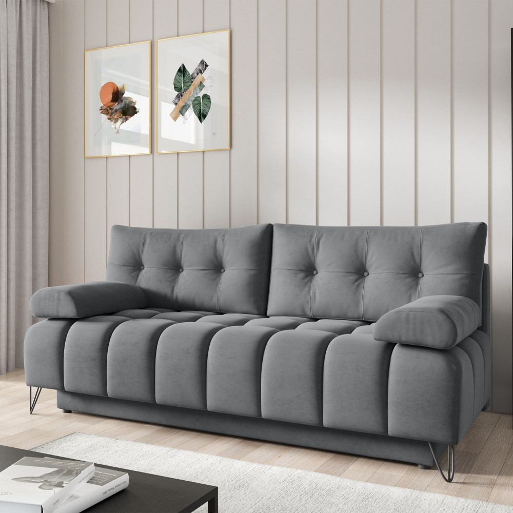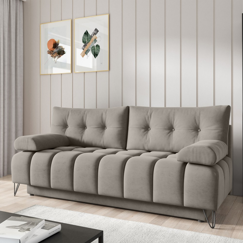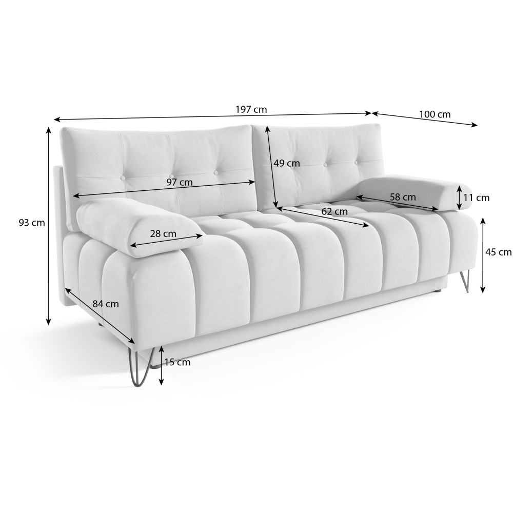 Pohovka BERGEN je ideální volbou pro každého, kdo nechce dělat kompromisy v pohodlí a funkčnosti v malém prostoru. Díky svým rozměrům (197 x 100 x 93 cm) se perfektně hodí do bytů, pokojů pro hosty nebo menších obývacích pokojů. Pohodlné sezení - Sedák s vlnovým pružinovým odpružením typu B a vysoce elastickou pěnou zajišťuje vysoké pohodlí a odolnost. Ať už čtete, sledujete televizi nebo relaxujete – vždy se zde budete pohodlně usadit. Funkce spaní a úložný prostor - Pohovka má praktickou funkci spaní, která ji během chvilky promění v pohodlnou postel. Integrovaný úložný prostor nabízí další prostor pro ložní prádlo, přikrývky nebo polštáře. Mechanismus DL umožňuje rychlé a snadné rozložení postele. Moderní design a vysoce kvalitní materiály - Pohovka čalouněná elegantní velurovou látkou Amon zaujme svým sofistikovaným vzhledem a příjemným pocitem na dotek. Robustní černé nohy dotvářejí moderní vzhled. Flexibilní umístění - Jako volně stojící kus nábytku s plně čalouněným opěradlem můžete pohovku volně umístit v místnosti nebo klasicky ke zdi. Rozměry: Šířka: 197 cm Výška: 93cm