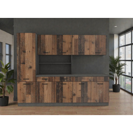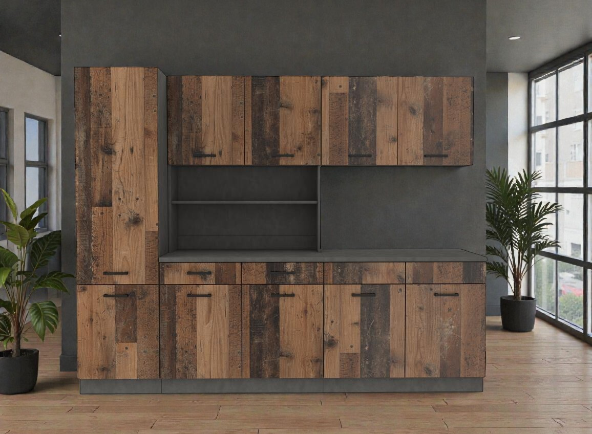 - Autentický design Old Wood: Přední plochy i korpusy jsou vyrobeny z 16mm laminované desky s věrnou imitací textury starého dřeva. Tento dekor dodává interiéru hloubku, charakter a útulnost.