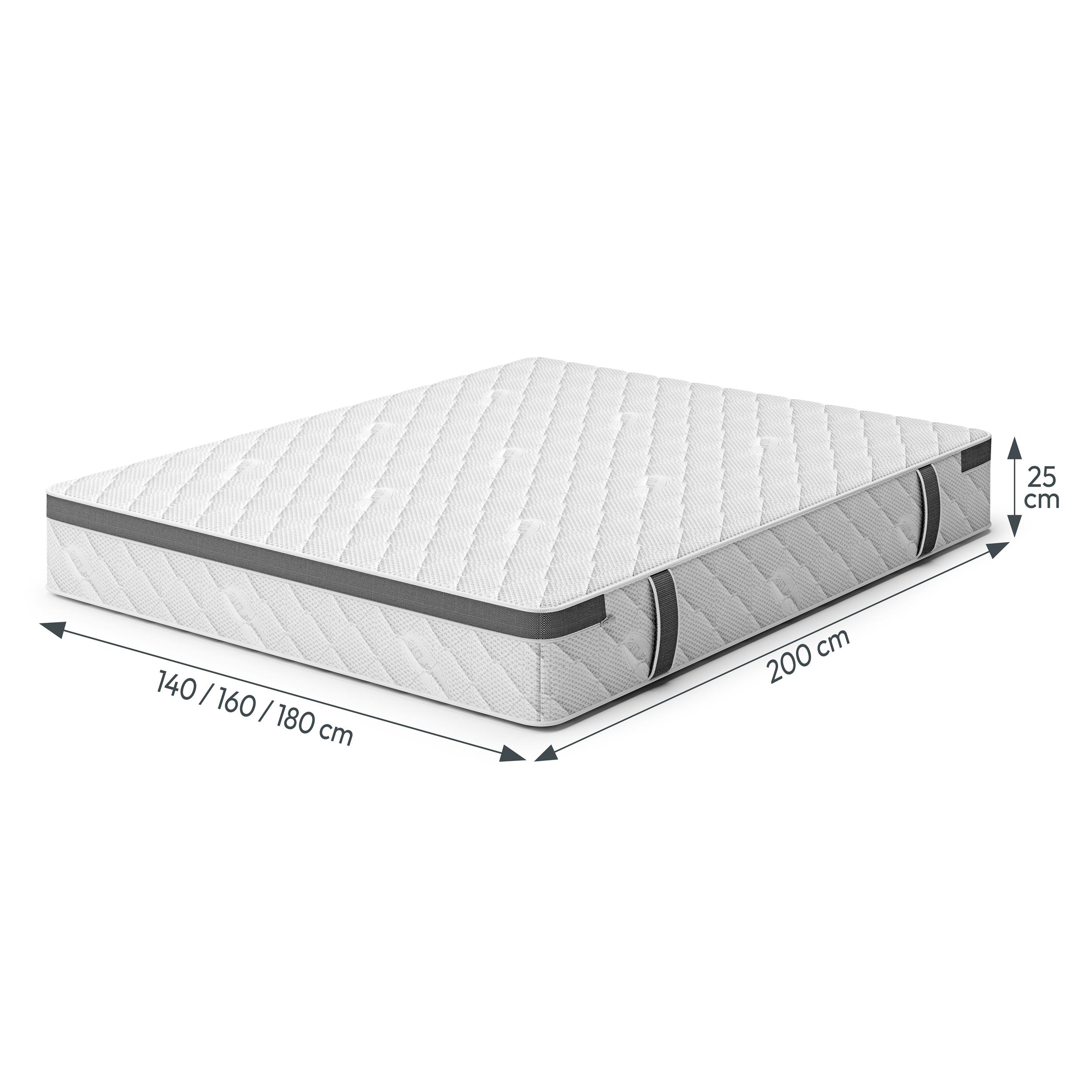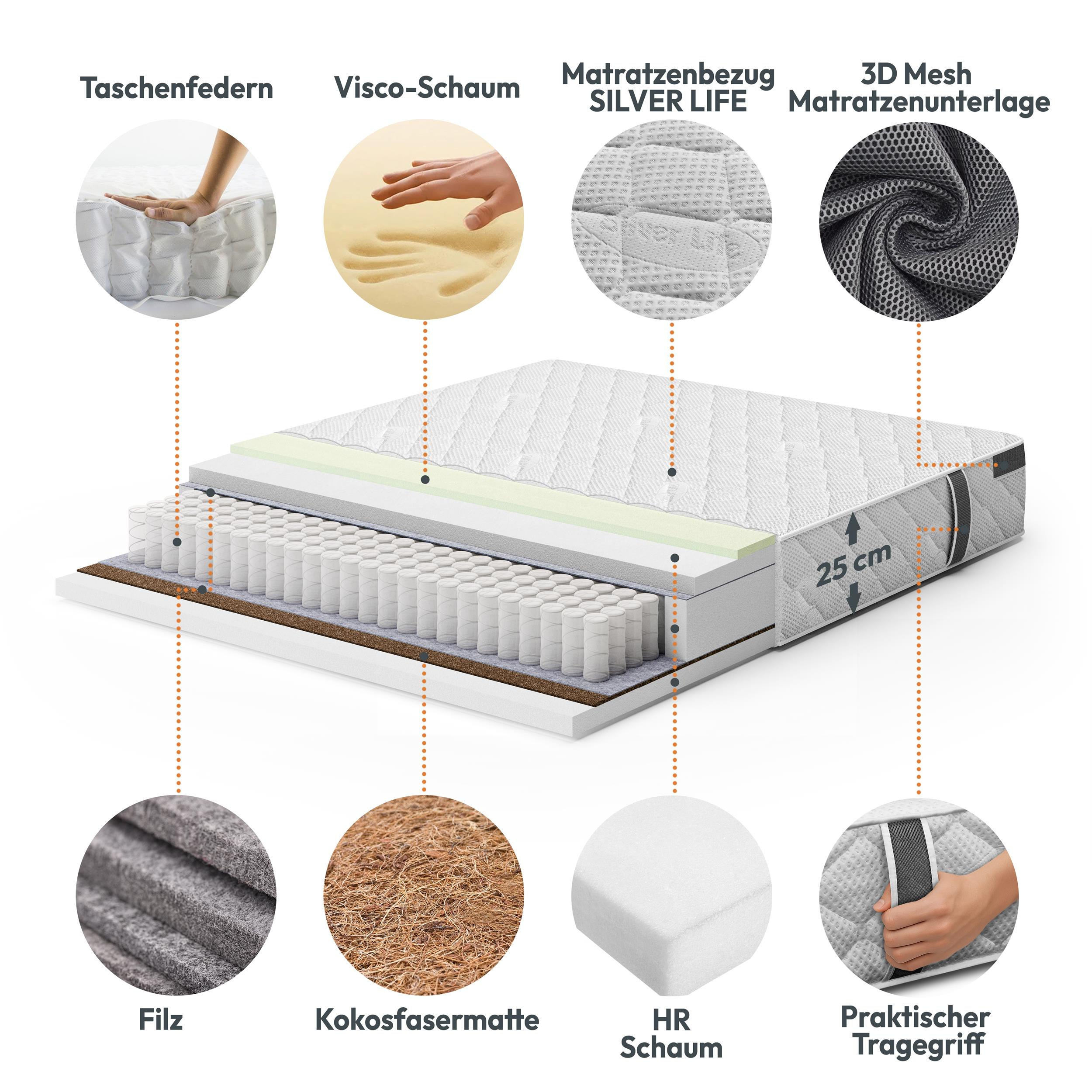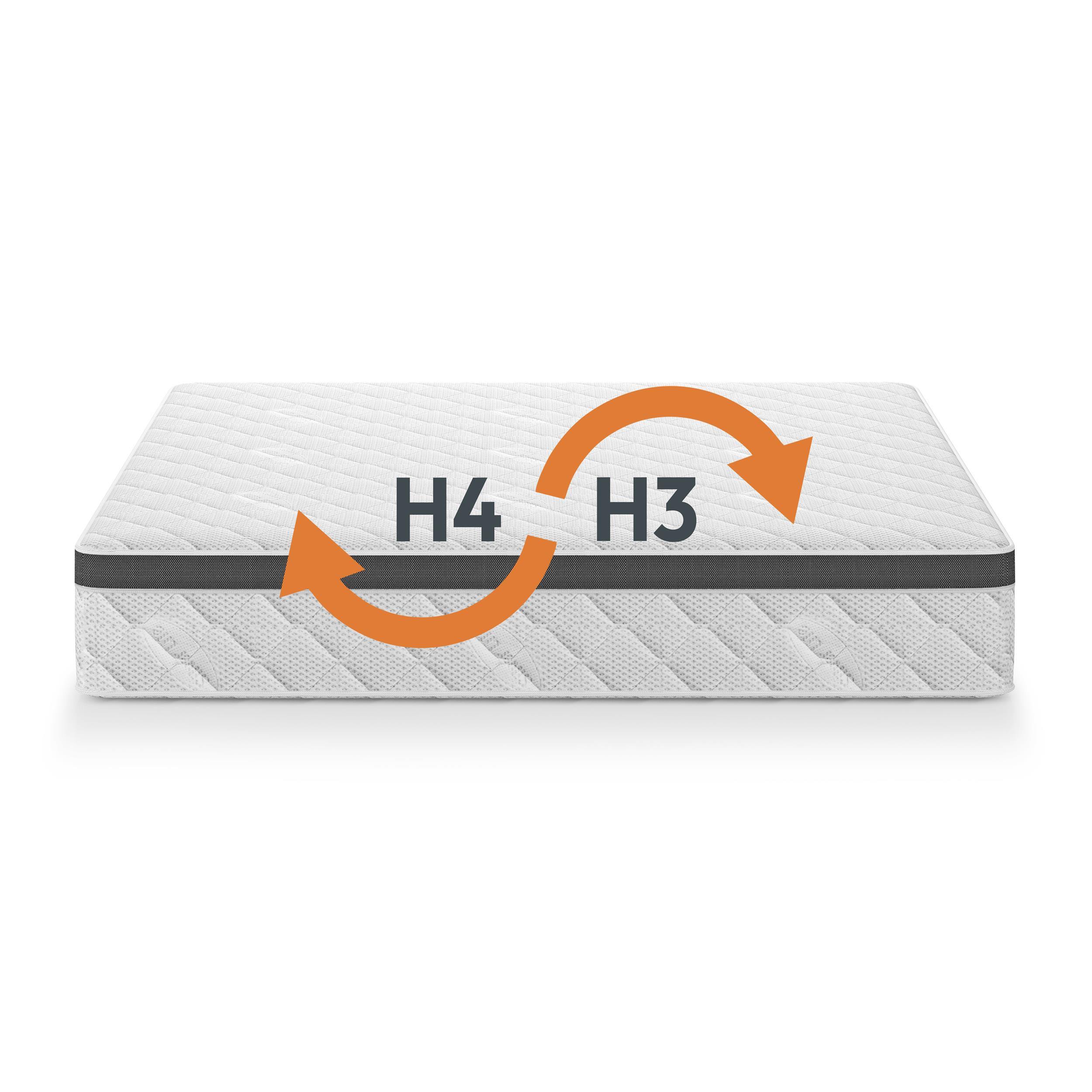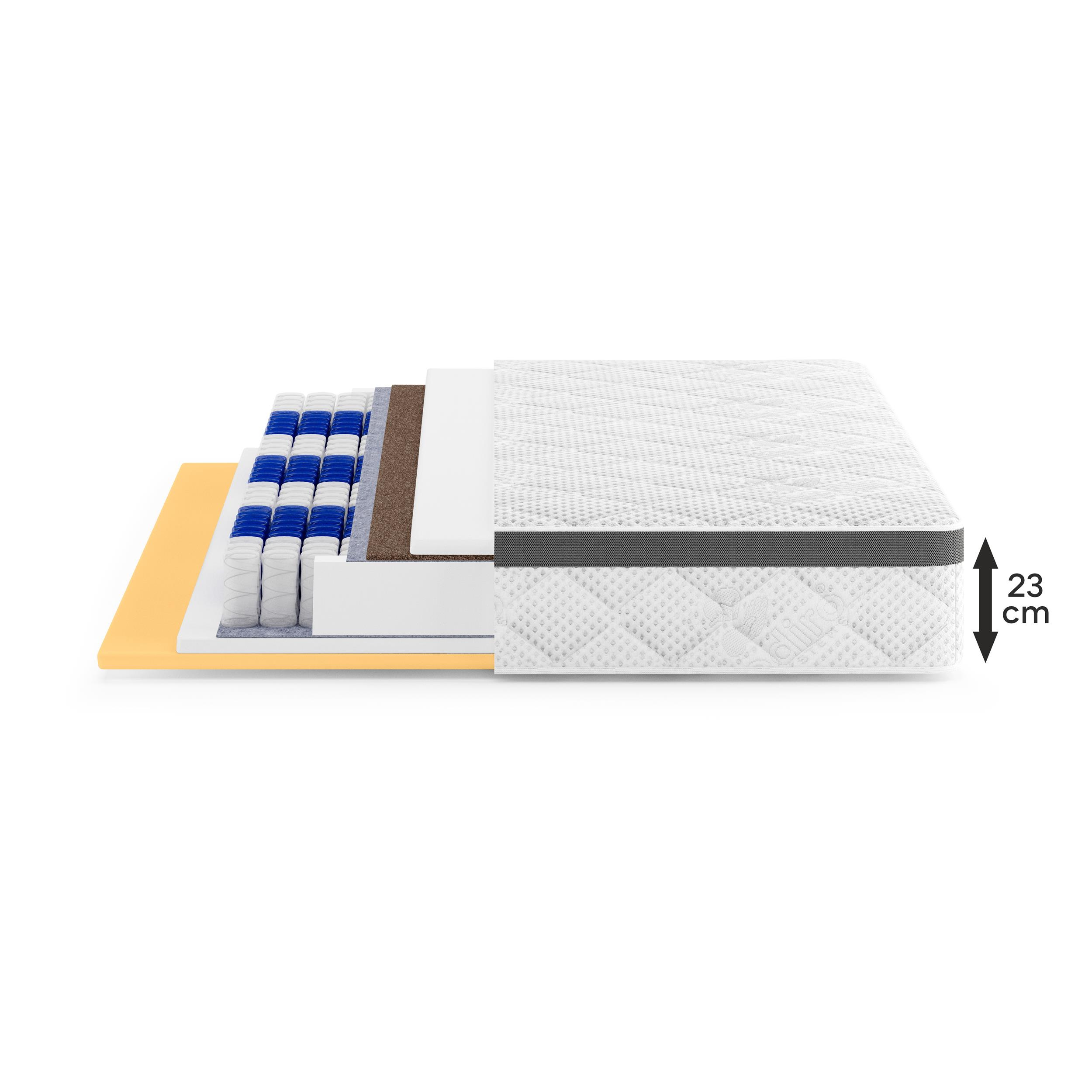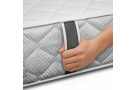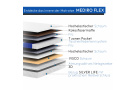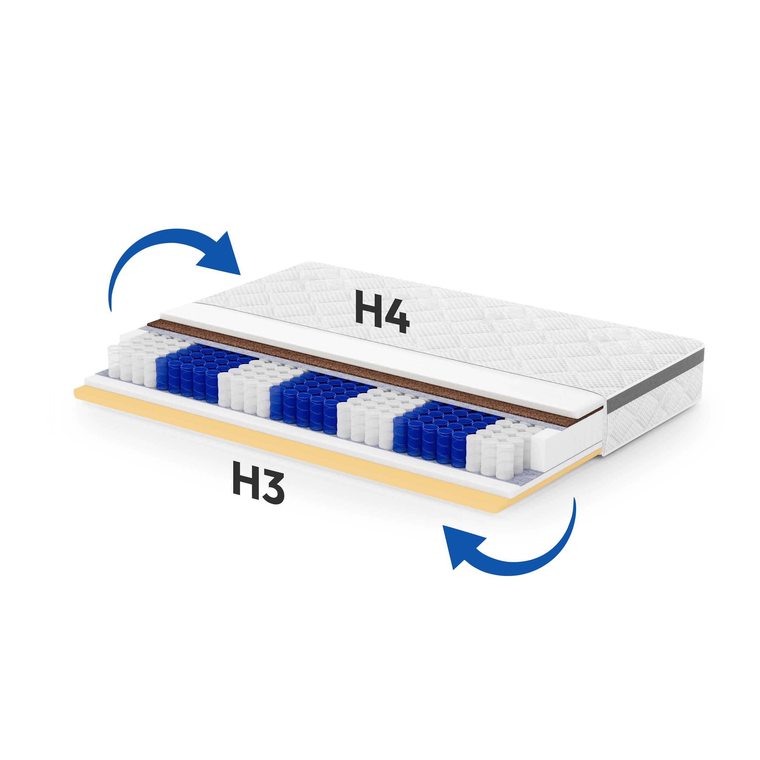 Matrace Mediro FLEX s taštičkovými pružinami byla vyvinuta tak, aby kombinovala maximální pohodlí při spaní, optimální oporu a hygienické vlastnosti. Díky inovativní kombinaci 7zónového jádra s taštičkovými pružinami, vysoce kvalitních pěn a prodyšného potahu je ideální pro každého, kdo si cení klidného a zdravého spánku. Oboustranná matrace se dvěma stupni tvrdosti – Matrace nabízí výběr mezi středně tvrdou (H3) a tvrdou (H4). To vám umožní vybrat si vhodnou plochu na ležení podle vašich individuálních potřeb nebo preferencí. Praktické rukojeti – Integrované rukojeti usnadňují otáčení a přepravu. Ideální pro pravidelné otáčení matrace a prodloužení její životnosti. Antibakteriální potah SILVER LIFE – Potah je vybaven 3D síťovinou a zajišťuje vysokou prodyšnost, regulaci teploty a hygienické prostředí pro spaní. Obsažené ionty stříbra mají také antibakteriální a hypoalergenní účinky. 7zónové jádro z taštičkových pružin – Jádro ze silných pružin nabízí bodově elastické přizpůsobení a ergonomickou oporu, takže páteř a svaly jsou optimálně uvolněny. Inovativní kombinace materiálů – Výplň se skládá z komfortní pěny, pěny Visco a vrstvy kokosových vláken o gramáži 800 g/m². Tato kombinace zajišťuje úlevu od tlaku, přizpůsobivost a příjemně suché prostředí pro spaní. Taštičková pružinová matrace MEDIRO FLEX kombinuje pohodlí, ergonomii a hygienu v jednom produktu. Díky oboustrannému designu, vysoce kvalitním materiálům a inovativnímu potahu poskytuje perfektní základ pro zdravý spánek – ať už preferujete středně tvrdý nebo tvrdý pocit. Odolná matrace, která je ideální pro různé spací návyky.