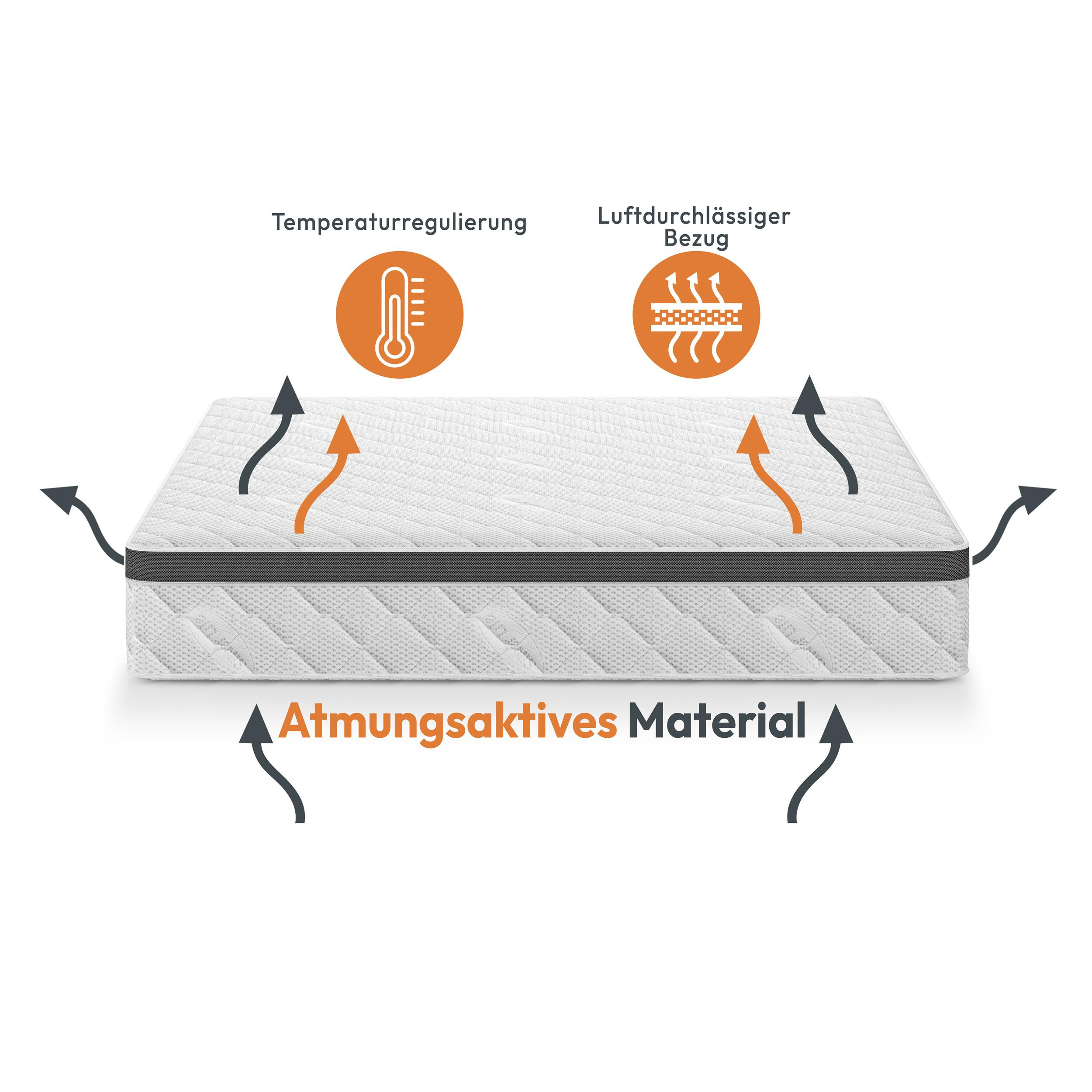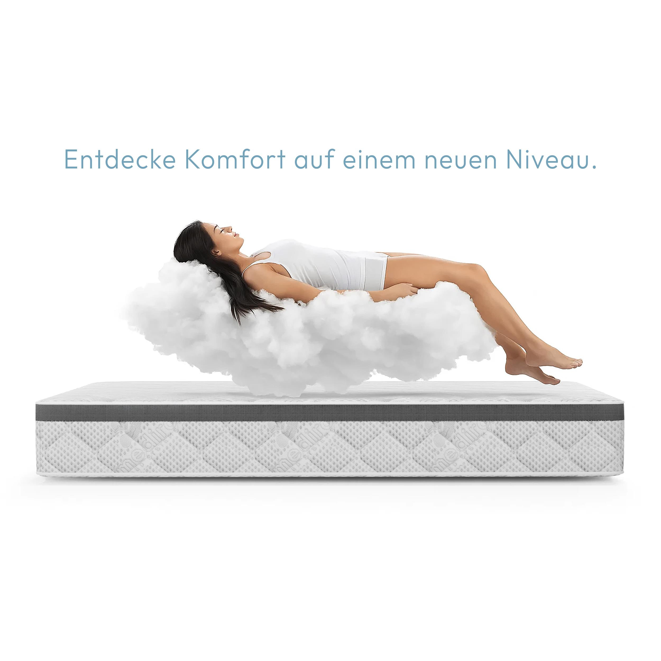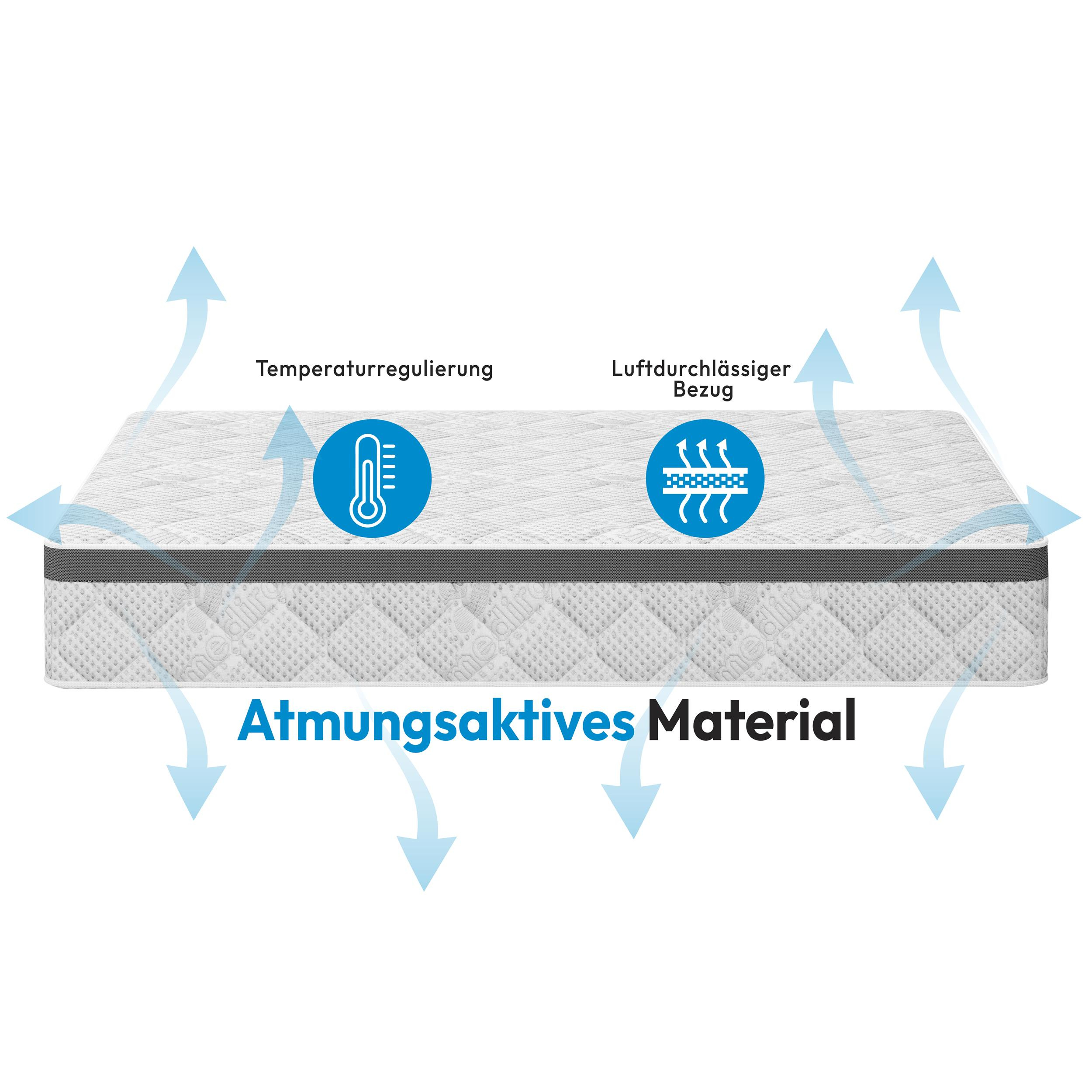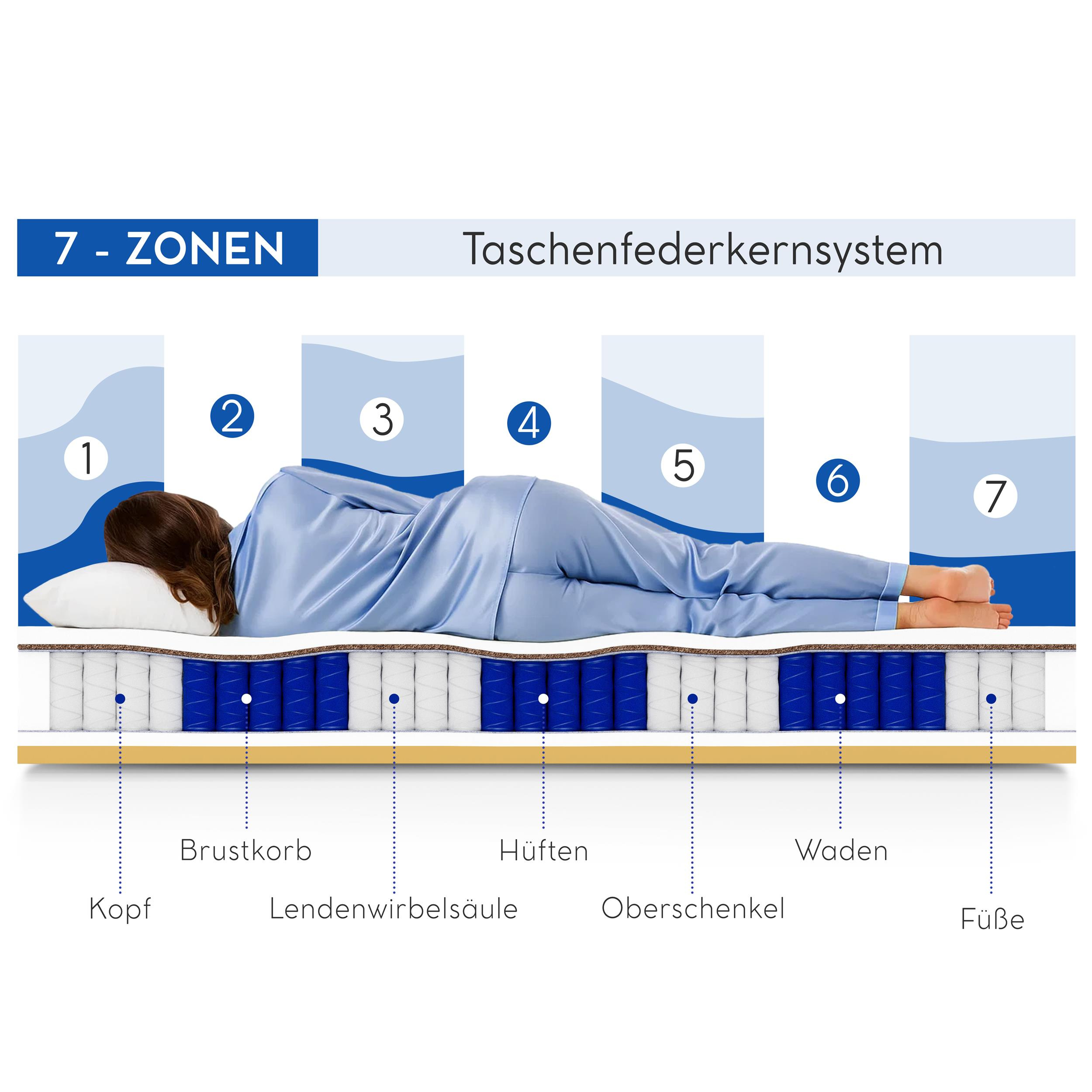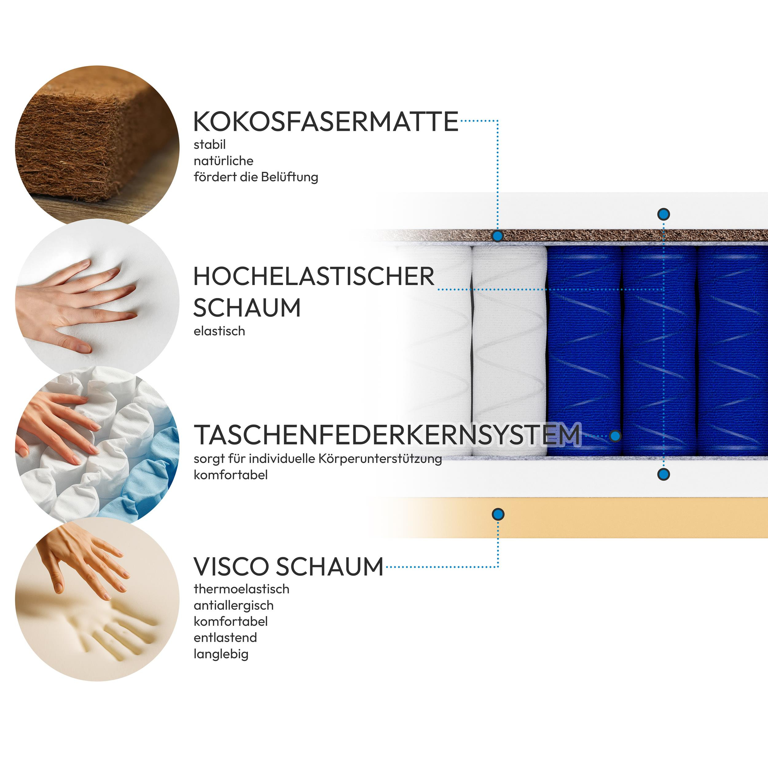 Matrace Mediro FLEX s taštičkovými pružinami byla vyvinuta tak, aby kombinovala maximální pohodlí při spaní, optimální oporu a hygienické vlastnosti. Díky inovativní kombinaci 7zónového jádra s taštičkovými pružinami, vysoce kvalitních pěn a prodyšného potahu je ideální pro každého, kdo si cení klidného a zdravého spánku. Oboustranná matrace se dvěma stupni tvrdosti – Matrace nabízí výběr mezi středně tvrdou (H3) a tvrdou (H4). To vám umožní vybrat si vhodnou plochu na ležení podle vašich individuálních potřeb nebo preferencí. Praktické rukojeti – Integrované rukojeti usnadňují otáčení a přepravu. Ideální pro pravidelné otáčení matrace a prodloužení její životnosti. Antibakteriální potah SILVER LIFE – Potah je vybaven 3D síťovinou a zajišťuje vysokou prodyšnost, regulaci teploty a hygienické prostředí pro spaní. Obsažené ionty stříbra mají také antibakteriální a hypoalergenní účinky. 7zónové jádro z taštičkových pružin – Jádro ze silných pružin nabízí bodově elastické přizpůsobení a ergonomickou oporu, takže páteř a svaly jsou optimálně uvolněny. Inovativní kombinace materiálů – Výplň se skládá z komfortní pěny, pěny Visco a vrstvy kokosových vláken o gramáži 800 g/m². Tato kombinace zajišťuje úlevu od tlaku, přizpůsobivost a příjemně suché prostředí pro spaní. Taštičková pružinová matrace MEDIRO FLEX kombinuje pohodlí, ergonomii a hygienu v jednom produktu. Díky oboustrannému designu, vysoce kvalitním materiálům a inovativnímu potahu poskytuje perfektní základ pro zdravý spánek – ať už preferujete středně tvrdý nebo tvrdý pocit. Odolná matrace, která je ideální pro různé spací návyky.