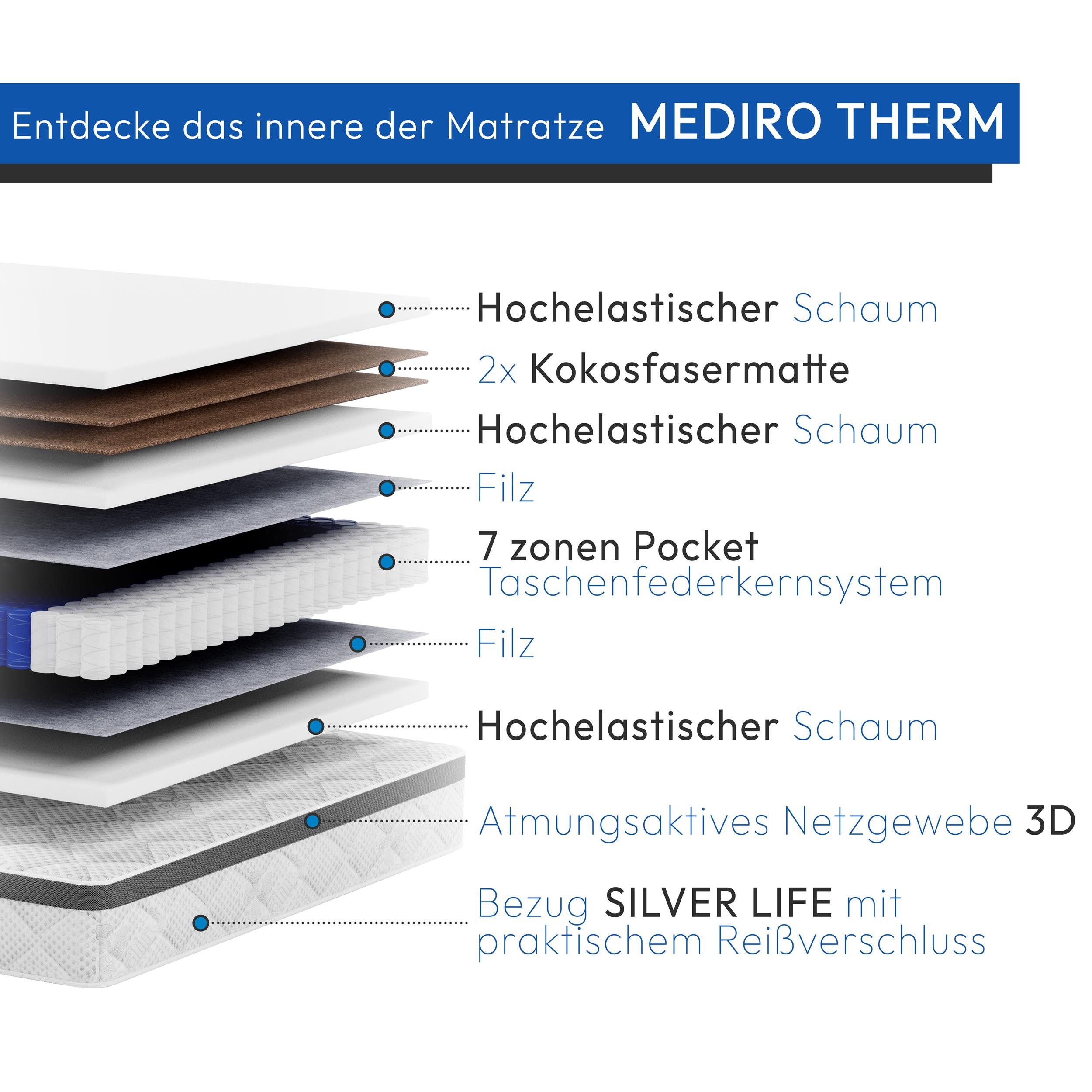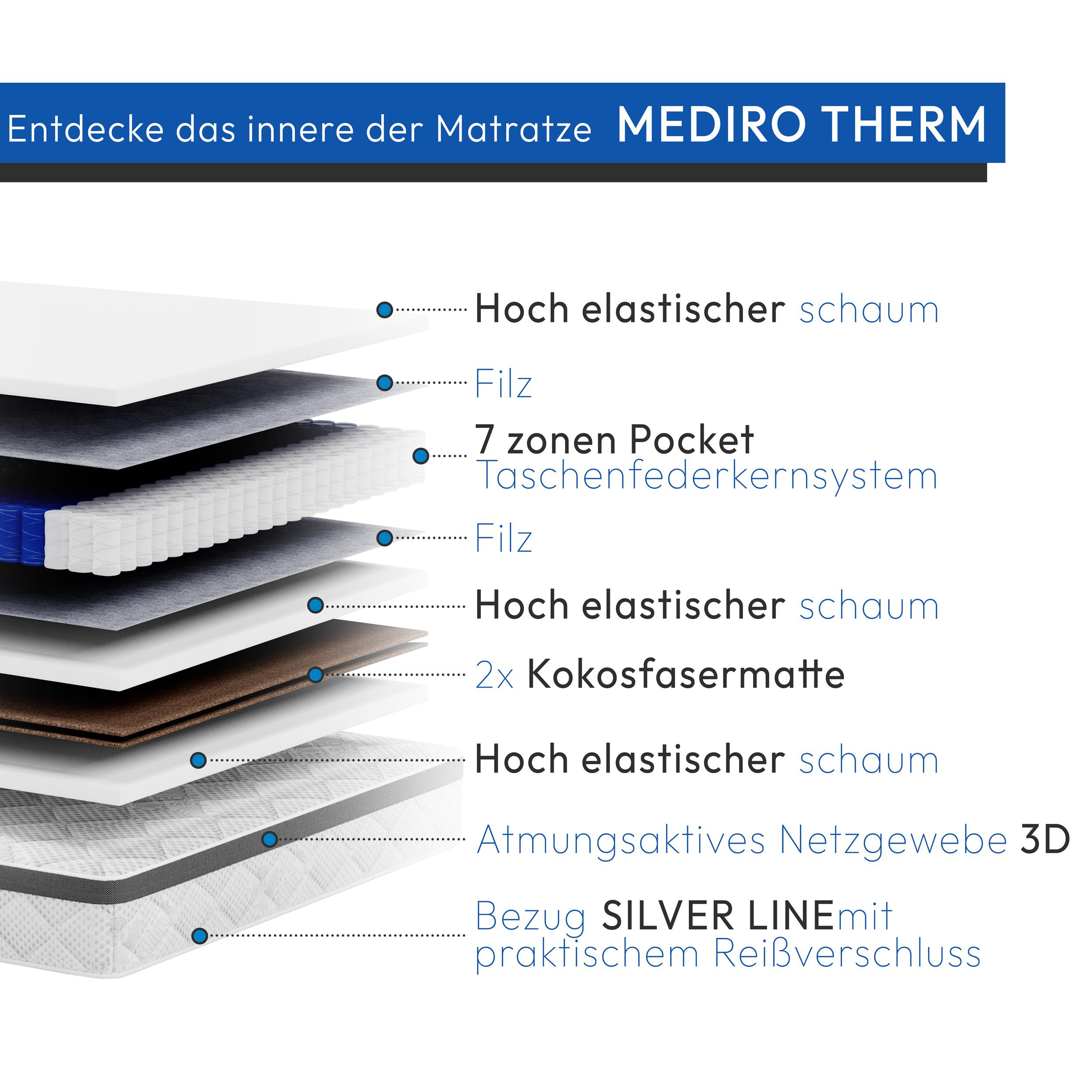 Matrace MEDIRO THERM má dvě strany, takže si můžete její tvrdost přizpůsobit svým potřebám. Oboustranná konstrukce umožňuje snadné nastavení úrovně pohodlí a prodlužuje životnost matrace. H3 - středně tvrdá. Vhodná pro osoby o hmotnosti 80-100 kg. Poskytuje elastickou, ergonomickou oporu bez propadávání. Udržuje páteř ve správné poloze.