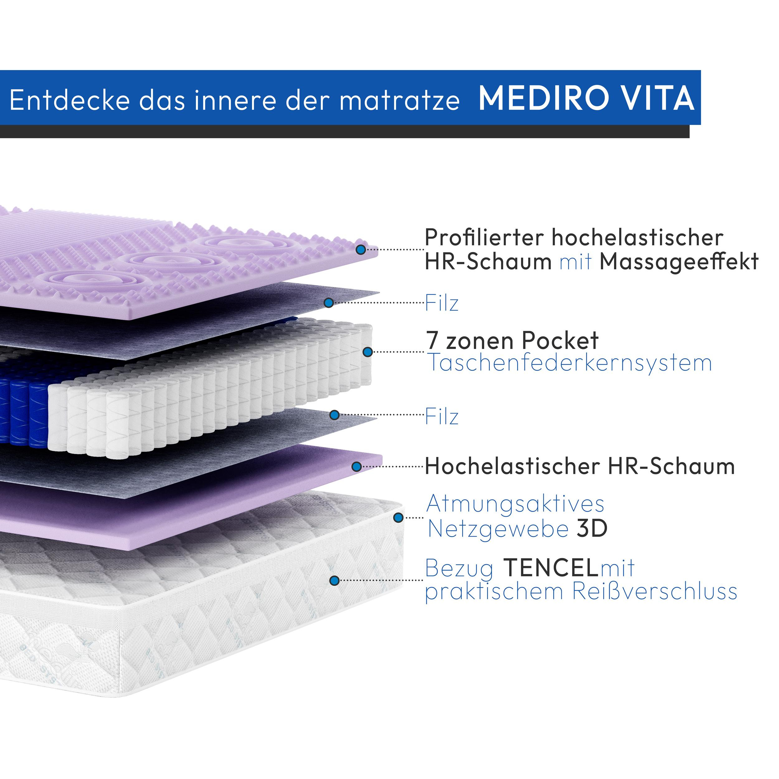 MEDIRO VITA je matrace s taštičkovými pružinami lékařské kvality, určená pro osoby, které potřebují stabilní oporu páteře, maximální pohodlí a úplnou regeneraci během spánku. H3 - střední tvrdost. Vhodná pro osoby o hmotnosti 80-100 kg. Poskytuje elastickou, ergonomickou oporu bez propadávání. Udržuje páteř ve správné poloze.