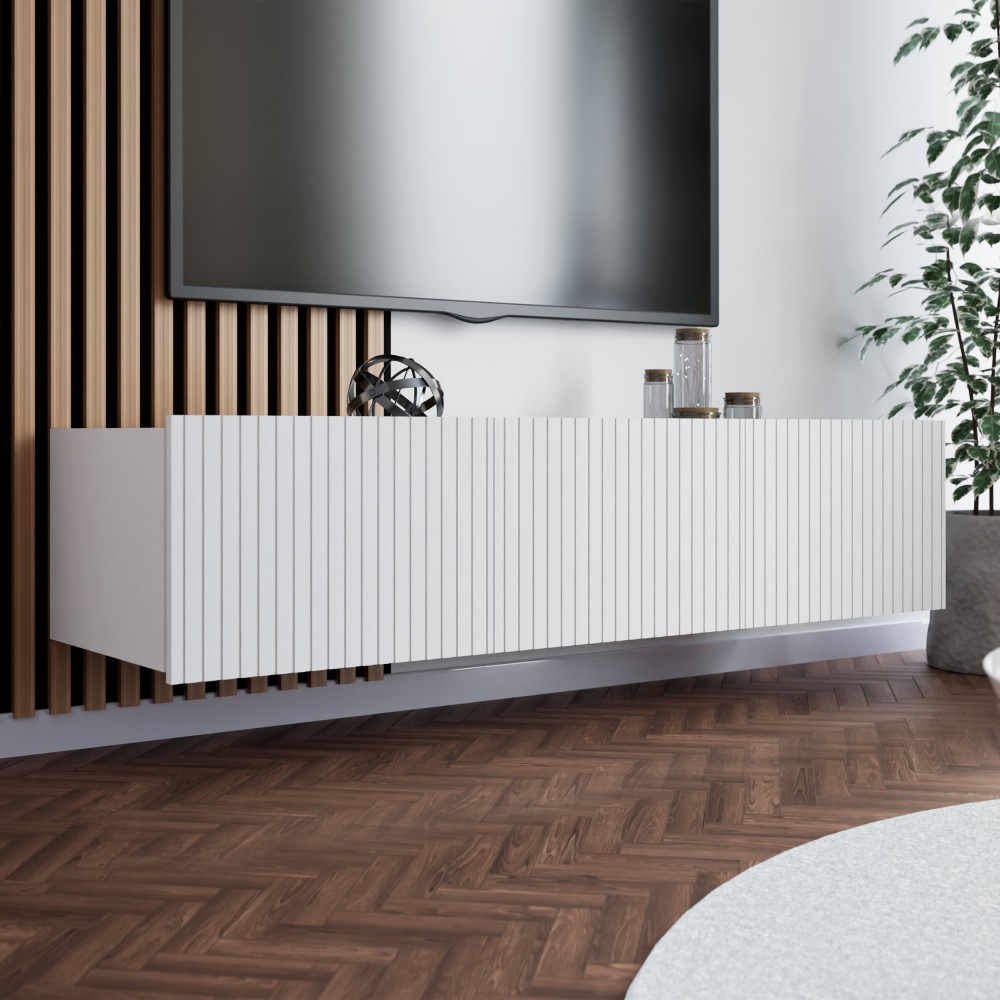 TV stolek KAVELL kombinuje moderní design s praktickou funkčností a je ideálním řešením pro stylové obytné prostory. Ať už je volně stojící nebo namontovaný na zeď, stolek harmonicky zapadne do jakéhokoli interiéru a zajistí pořádek a přehlednost kolem vašeho multimediálního zařízení. Robustní konstrukce: Vyrobeno z 16mm dřevotřísky, odolné a stabilní. Drážkované čela: 16mm MDF panely dodávají stolku moderní a elegantní vzhled. Tiché zavírání: Rychloupínací panty zajišťují plynulé a tiché otevírání a zavírání dvířek. Flexibilní použití: Univerzální skříňka, lze ji namontovat nastojato i na zeď. Balení obsahuje nožičky a závěsy pro maximální flexibilitu. Moderní výběr barev: K dispozici v matně bílé, kašmírové, matně černé nebo řemeslném dubu – pro různé styly interiérového designu. Praktické rozměry: 150 × 43 × 34/37,5 cm, ideální pro kompaktní prostory a jako stylové řešení pro televizi.