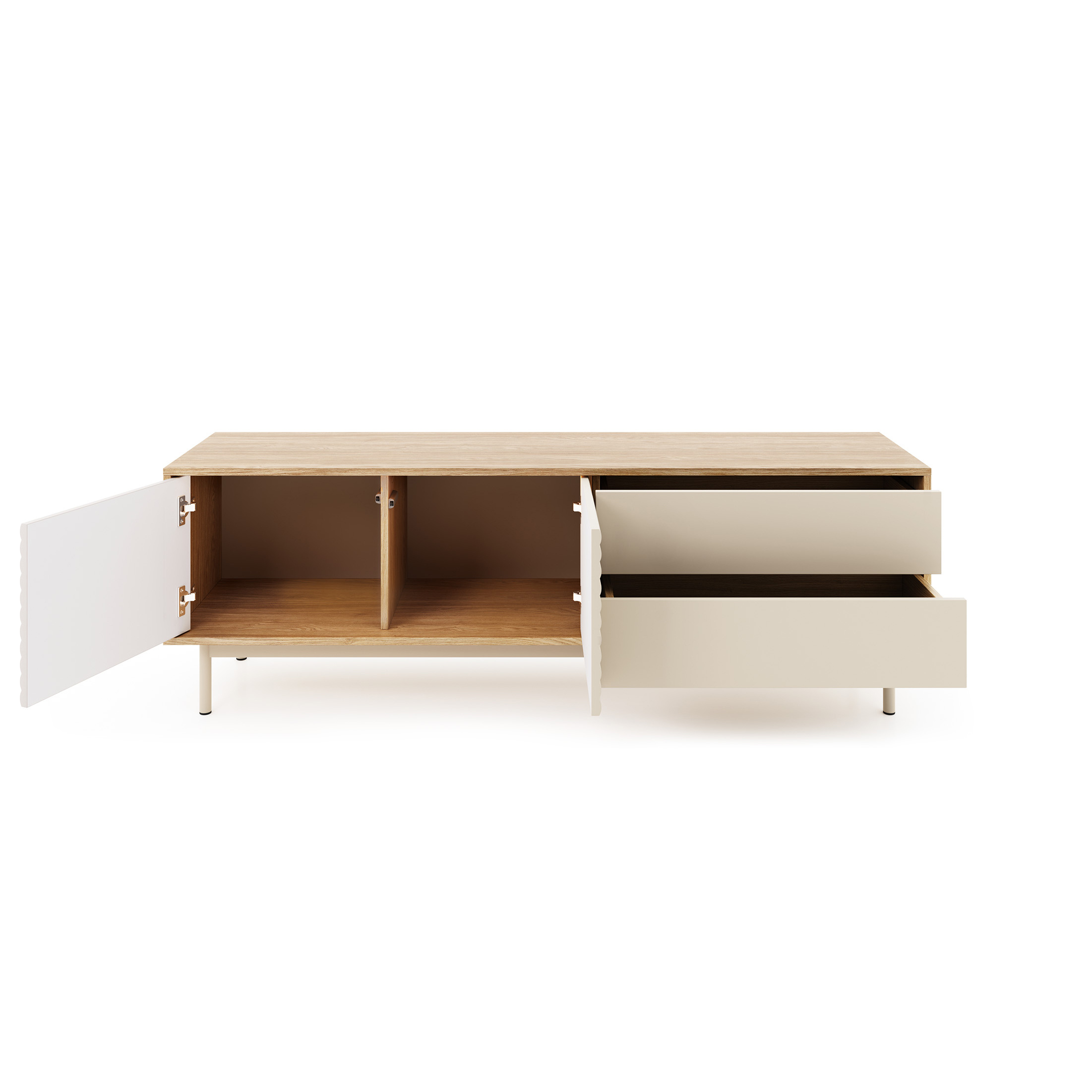 TV stolek TERRA se 2 dvířky a 2 zásuvkami Specifikace TERRA: Dvoudveřový design – dostatek úložného prostoru 2 prostorné zásuvky – praktický a snadno dostupný prostor pro drobnosti 2 vroubkované čela s osvětlením – výrazný stylový akcent Pevná konstrukce s důrazem na detail Moderní otevírací systém bez úchytek Odolná MDF deska a laminovaný korpus Kovové nohy v moderním designu LED osvětlení vroubkovaných čela součástí balení Barva: Kašmír/olejovaný dub TV stolek TERRA kombinuje stylovou estetiku s praktickou každodenní použitelností a stává se vrcholem každého obývacího pokoje. Jeho harmonické barevné schéma v kašmíru a olejovaném dubu dodává místnosti teplou, elegantní atmosféru – ideální pro moderní i klasicky zařízené interiéry. Stylové detaily a vysoce kvalitní materiály: Vroubkované čela s integrovaným LED osvětlením vytvářejí působivý designový prvek a příjemnou světelnou atmosféru. Moderní otevírací systém bez úchytek podtrhuje čisté, minimalistické linie. Skříňka je vyrobena z robustní MDF desky a laminovaného korpusu a zaujme svou vysokou stabilitou a snadnou údržbou. Kovové nohy dotvářejí celkový vzhled a vytvářejí moderní, plovoucí vzhled. Spousta úložného prostoru a praktické uspořádání: Za dvěma dvířky nabízí televizní stolek dostatek prostoru pro elektronická zařízení, kabely nebo DVD. Úložný prostor je doplněn dvěma snadno přístupnými zásuvkami, ideálními pro dálkové ovladače, hry nebo jiné drobnosti. Díky promyšlenému uspořádání zůstává obývací prostor vždy uklizený a čistý – bez kompromisů v designu. Elegantní prvek vašeho obývacího pokoje. Díky kombinaci funkčnosti, vysoce kvalitního zpracování a sofistikovaného osvětlení je televizní stolek TERRA perfektní volbou pro milovníky moderního designu. Harmonicky se hodí do každého obytného prostoru a vytváří stylovou atmosféru – ve dne i v noci.