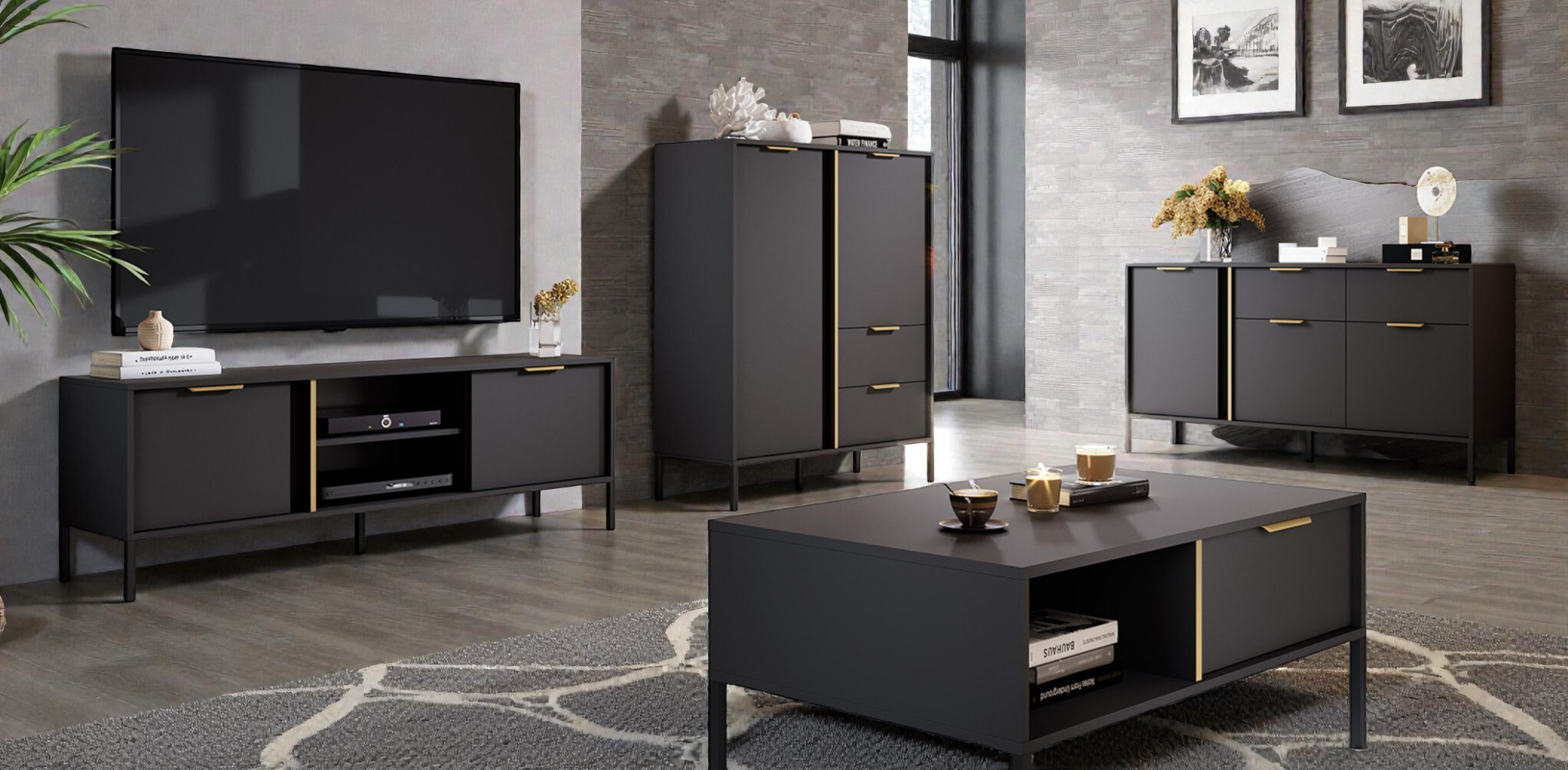 Hledáte nábytek, který definuje prostor a dodá mu punc exkluzivity? Kolekce Tereno je vytříbenou odpovědí i pro ty nejnáročnější zákazníky. Tato sestava představuje fascinující spojení hlubokého antracitu a zářivých zlatých detailů, které společně vytvářejí atmosféru moderního paláce přímo u vás doma.