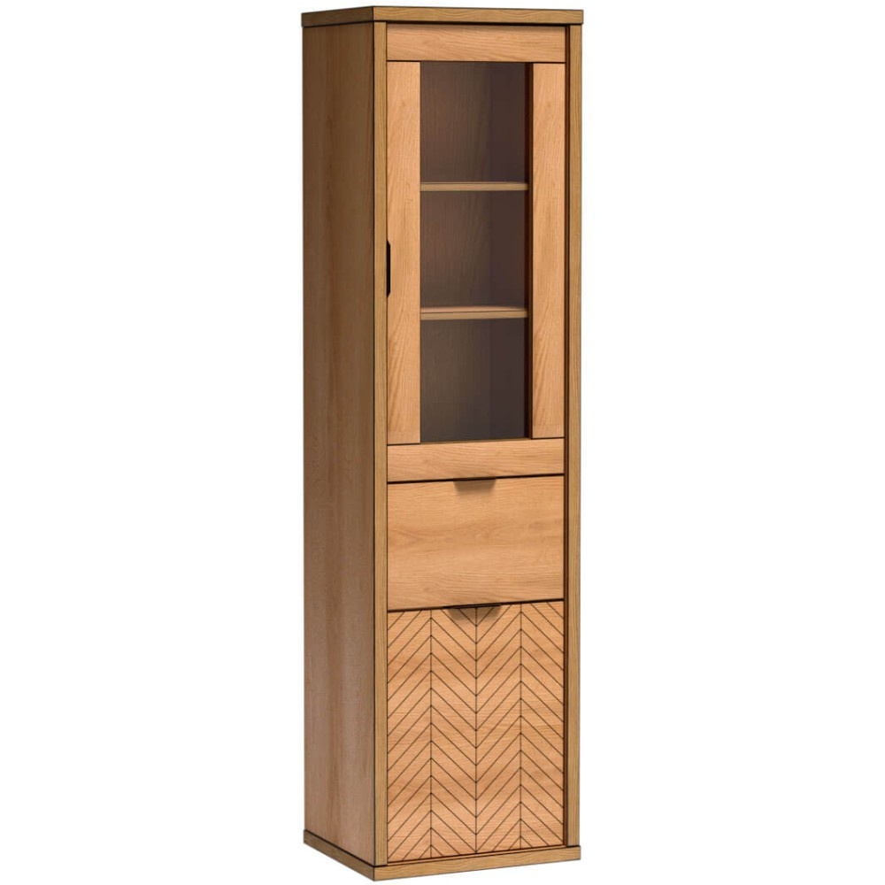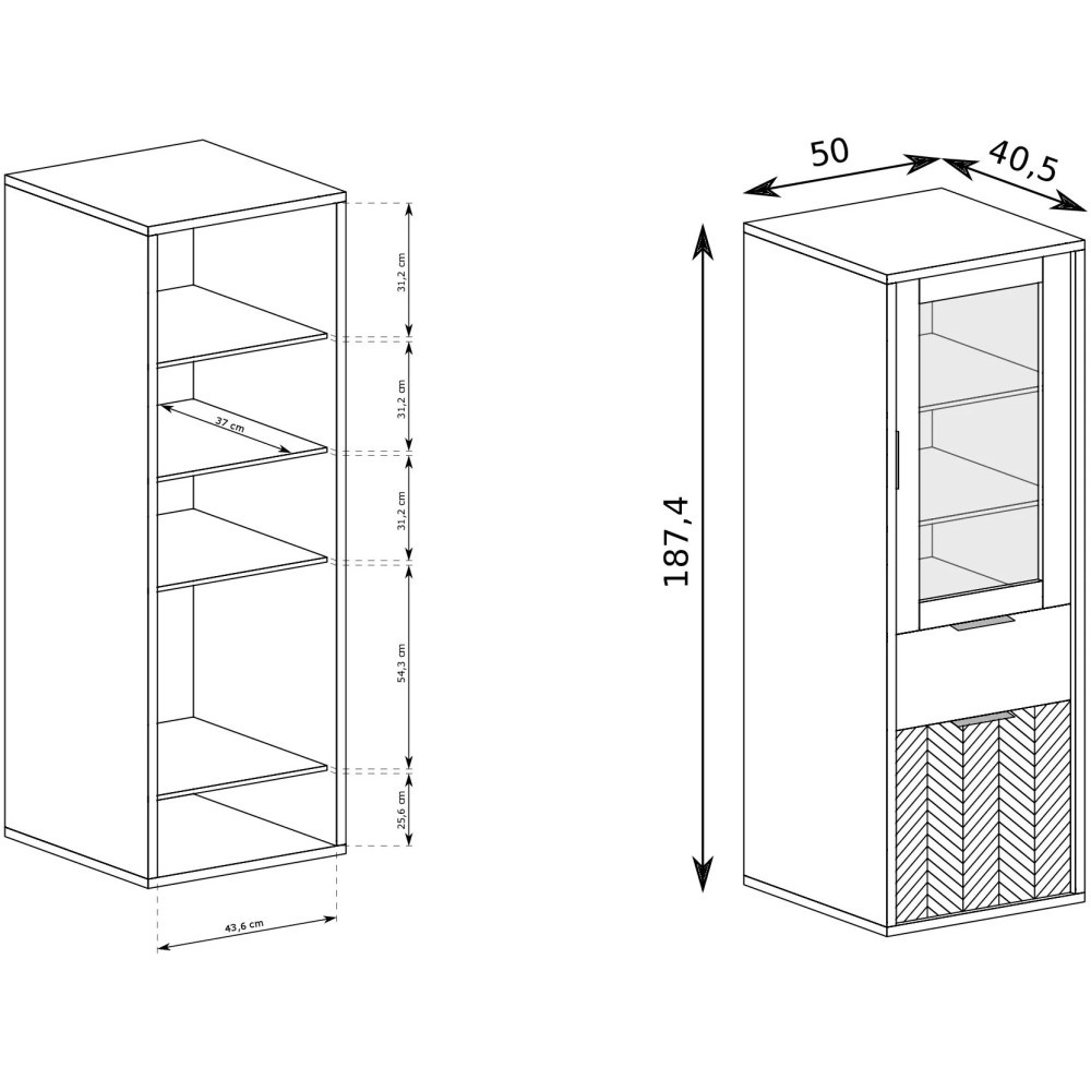 Vitrína s 1 zásuvkou a 2 dvířky ze série FUN kombinuje moderní design s promyšlenou funkčností. Kombinace skleněných dvířek a dvířek s trendy vzorem rybí kosti vytváří vzrušující mix materiálů a dodává nábytku elegantní městský vzhled. Díky vysoce kvalitnímu melaminovému povlaku se povrch obzvláště snadno čistí a je odolný při každodenním používání. Integrovaná funkce tlumení umožňuje jemné a tiché zavírání – bez jakéhokoli bouchání. V závislosti na vkusu a stylu interiérového designu lze vitrínu konfigurovat s 12 cm vysokými černými kovovými nohami nebo bez nich – pro plovoucí nebo stabilní stojan. Díky kompaktním rozměrům 50 x 41 x 187 cm je tento kus nábytku ideální do menších místností nebo jako stylový doplněk ke stávajícímu nábytku. Zkombinujte vitrínu s dalšími prvky z kolekce FUN a vytvořte tak jedinečný a moderní vzhled vašeho domova. Rozměry: Rádi bychom vás informovali, že všechny rozměry čalouněného nábytku mají toleranci +/- 2 %. Snažíme se zobrazit všechny barvy co nejpřesněji. Upozorňujeme však, že v důsledku nastavení monitoru a grafické karty se mohou vyskytnout drobné odchylky. Toto není důvod k reklamaci. Barvy různých sérií látek se navíc mohou mírně lišit v odstínu. Dodání je možné na adresy v rámci Německa. Nedodáváme na ostrovy ani do horských oblastí. Máme vlastní bezpečnou a rychlou přepravní službu. O datu dodání budete předem informováni.