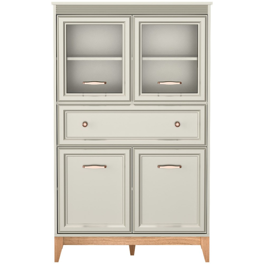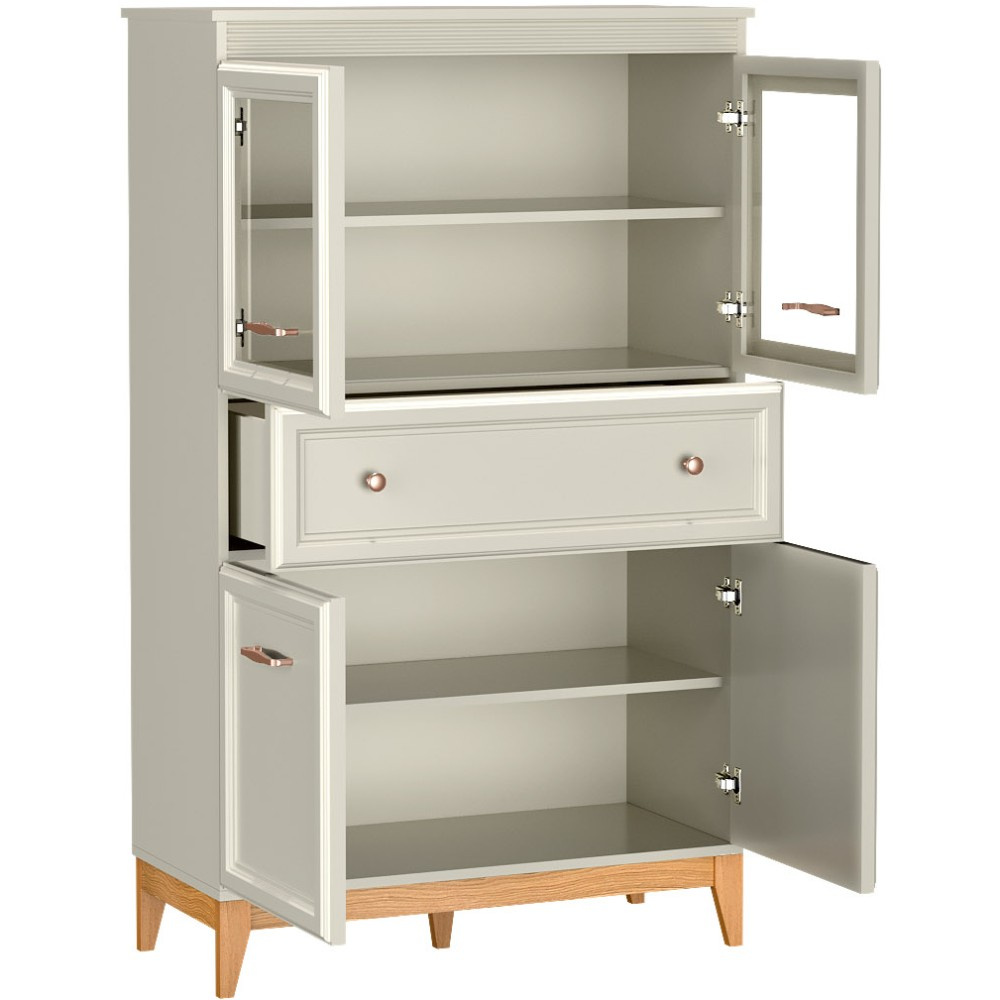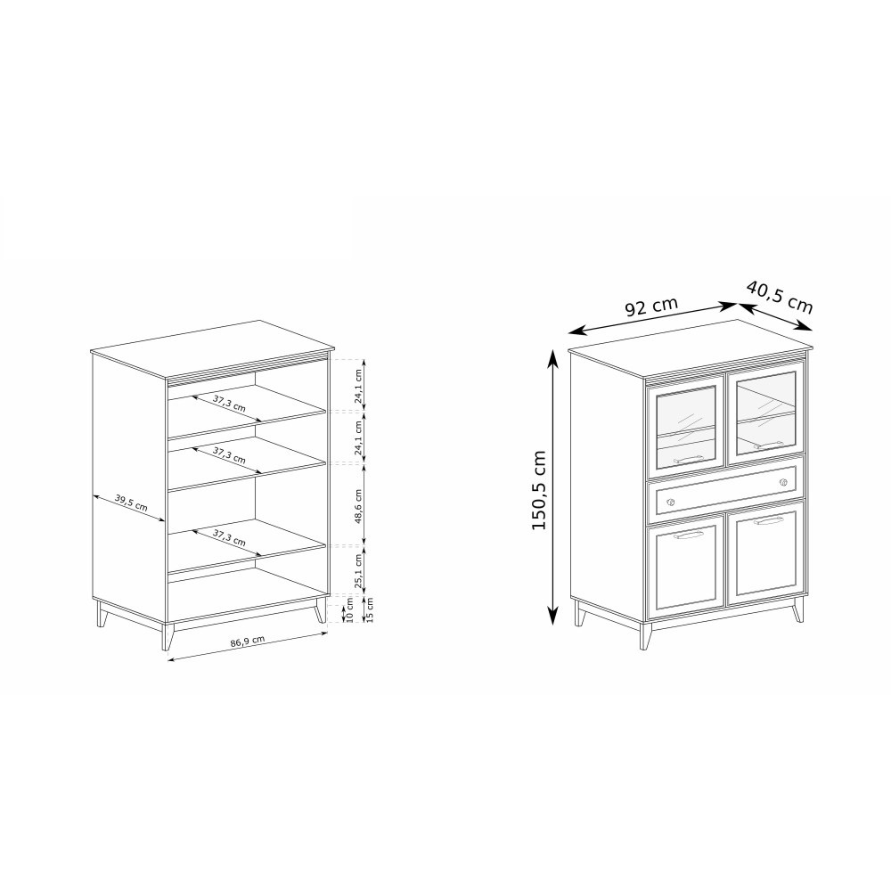 Nahoře: dvoje skleněné dveře s policí, Uprostřed: prostorná zásuvka, Dole: dvoudveřová uzavřená skříňka s policí,