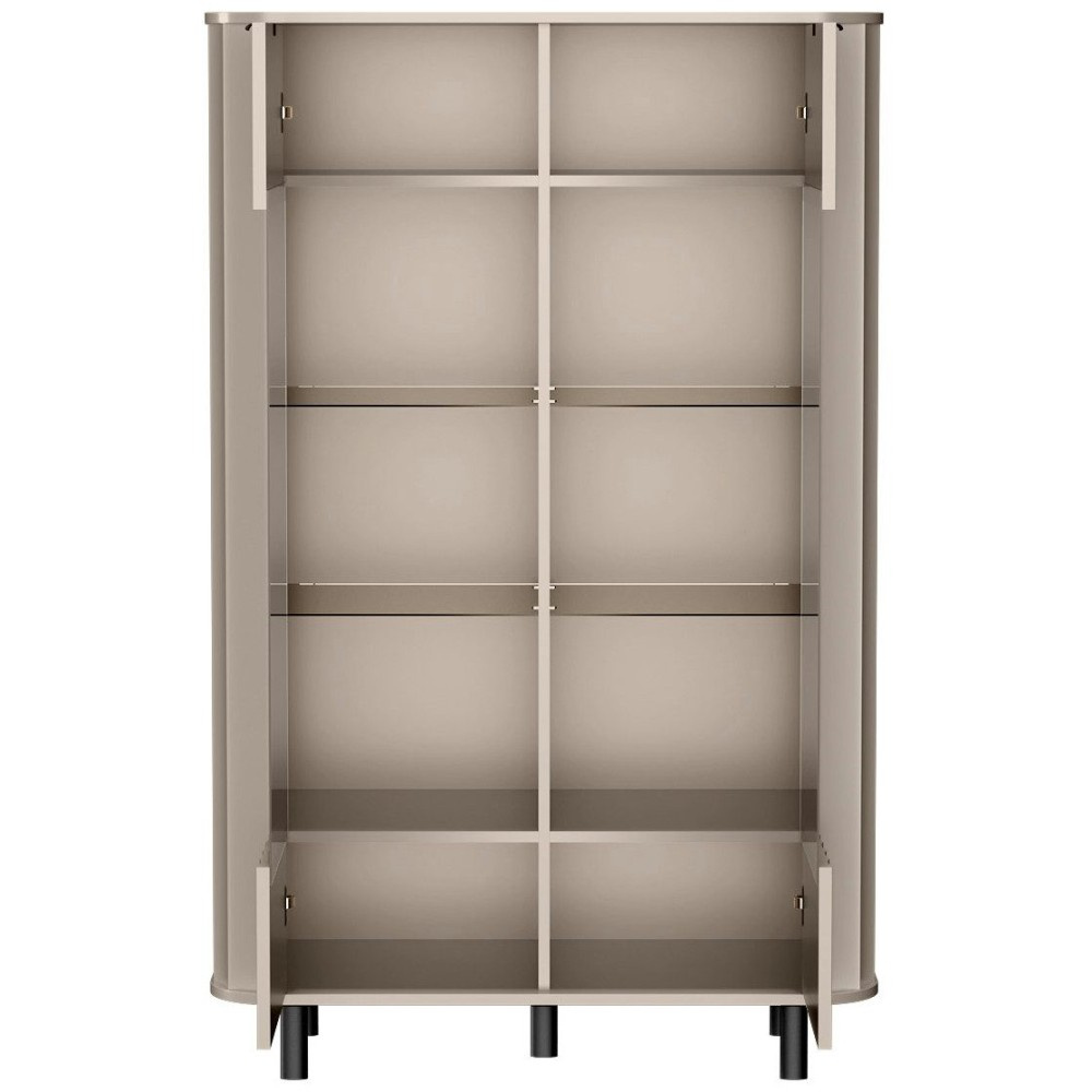 Vitrína NEVADA kombinuje funkční úložný prostor s čistým, moderním designem. Díky dvěma skleněným dvířkům nabízí elegantní způsob, jak stylově vystavit dekorativní předměty, knihy nebo jemné nádobí – to vše bez rušivé techniky či osvětlení. Přední strany s vertikální strukturou v dekorativní dřevěné povrchové úpravě dodávají tomuto kusu nábytku moderní a útulný nádech. V kombinaci s klidným barevným schématem v odstínu