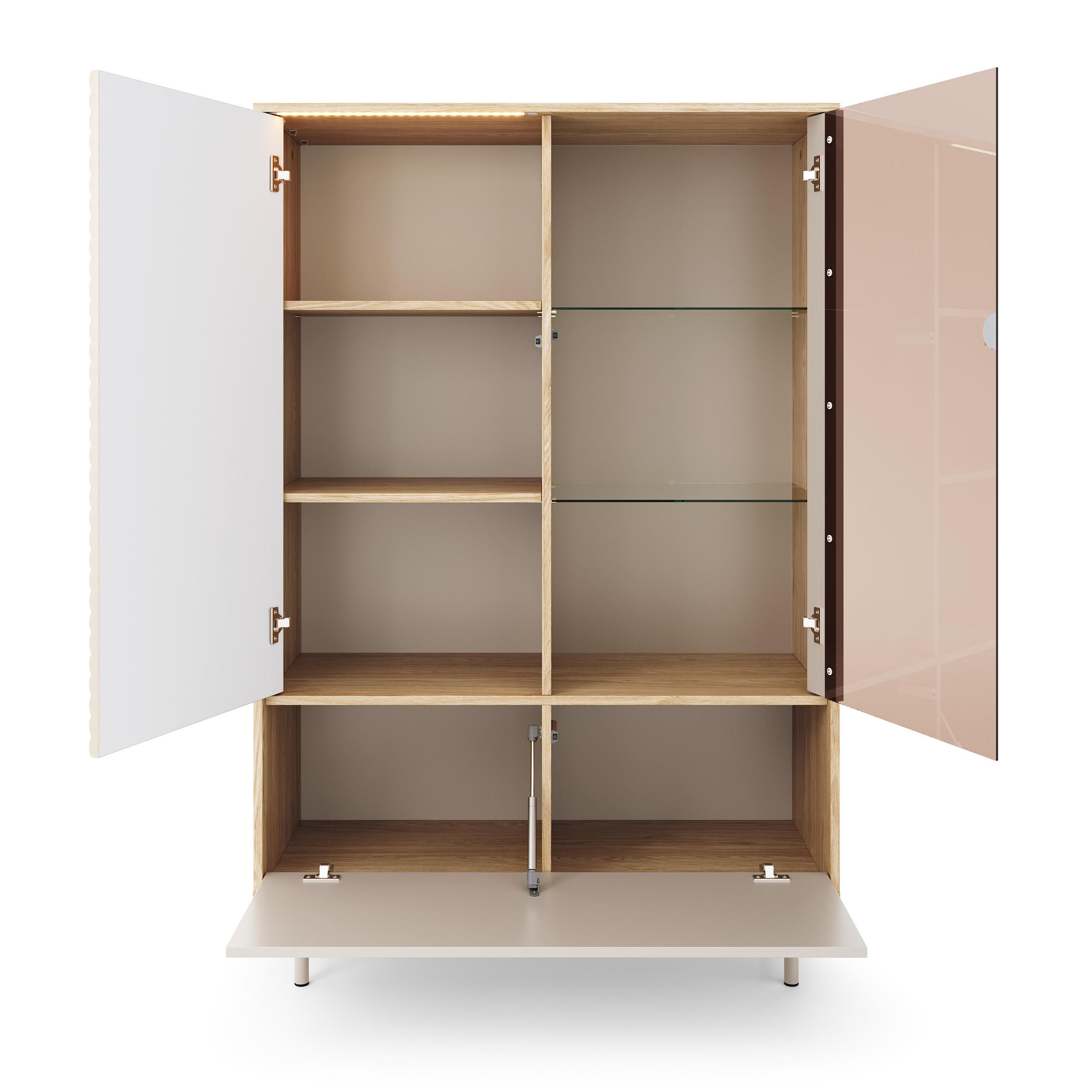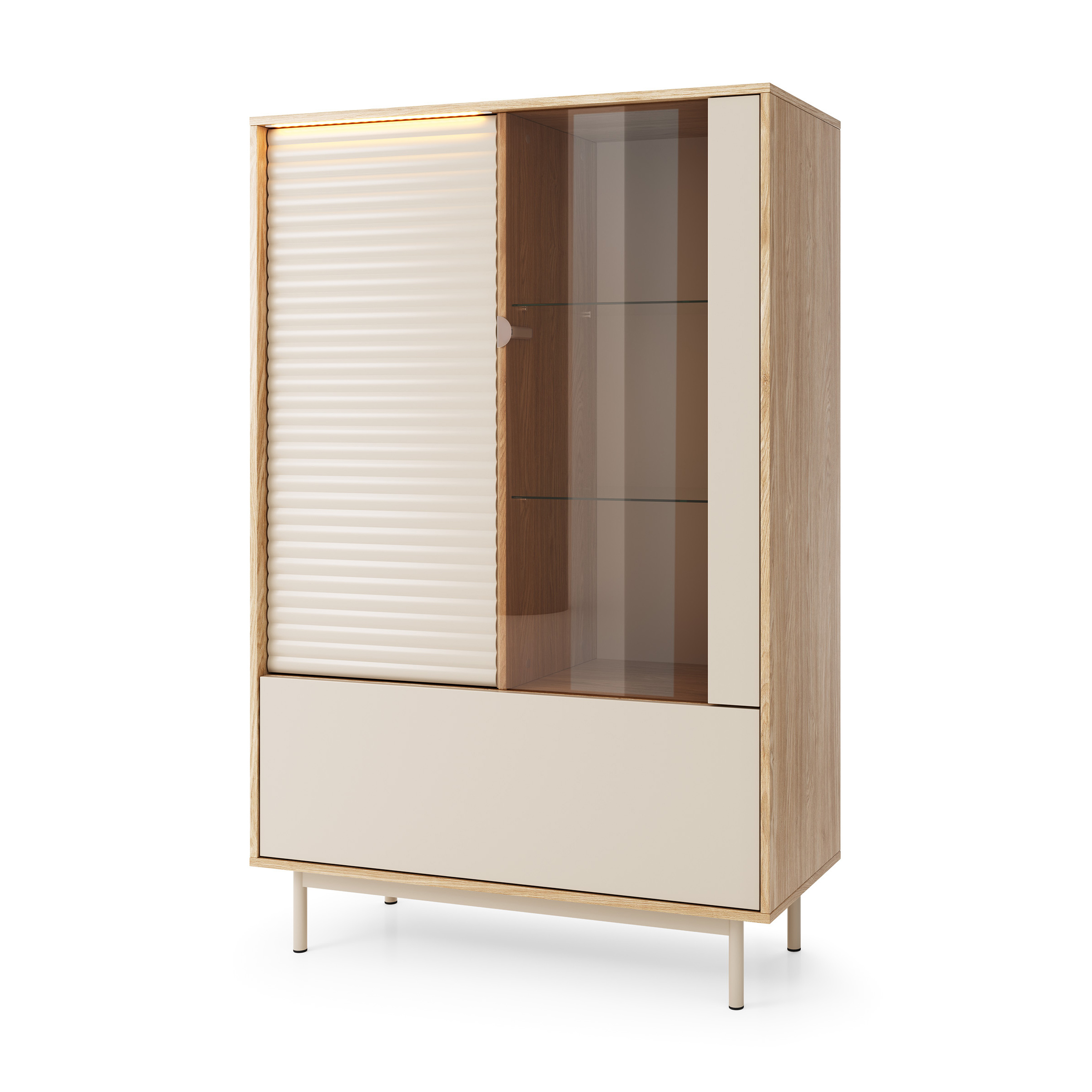 Vitrína TERRA je stylový kus nábytku, který kombinuje moderní design s funkční sofistikovaností. Její harmonické barevné schéma kašmíru a olejovaného dubu vytváří teplou a příjemnou atmosféru a dokonale se hodí do široké škály stylů interiérového designu – od moderního a skandinávského až po klasický a elegantní. Promyšlené řemeslné zpracování a vysoce kvalitní materiály: Přední strany vitríny jsou bez úchytek a vyznačují se jemným frézovaným vzorem, který dodává kusu charakteristickou texturu. Odolný korpus z laminované MDF desky zaručuje dlouhou životnost a snadnou každodenní údržbu. Robustní kovové nohy v moderním designu dodávají vitríně nejen elegantní vzhled, ale také zajišťují stabilitu a lehký, vzdušný vzhled. Funkčnost a stylová prezentace: Za třemi dvířky se skrývá dostatek úložného prostoru, který nabízí místo na nádobí, knihy nebo dekorativní doplňky. Zvláštním lákadlem je dodávané LED osvětlení – efektivně prezentuje vystavené předměty a vytváří v místnosti příjemnou světelnou atmosféru. Kus nábytku se stylem a charakterem. Vitrína TERRA je perfektní volbou pro každého, kdo si cení designu, kvality a funkčnosti. Ať už v obývacím pokoji, jídelně nebo kanceláři – stane se elegantním ústředním bodem každé místnosti a dodá vašemu domovu moderní a stylový nádech. Objevte další nábytek z kolekce TERRA v našich dalších aukcích a vytvořte si v celém domě ucelený vzhled. Rozměry: 100 Výška: 152 cm Hloubka: 40 cm Rádi bychom vás informovali, že všechny rozměry čalouněného nábytku podléhají toleranci +/- 2 %. Snažíme se zobrazit všechny barvy co nejpřesněji. Upozorňujeme však, že v důsledku nastavení monitoru a grafické karty se mohou vyskytnout drobné odchylky. Toto není důvod k reklamaci. Kromě toho se barvy různých sérií látek mohou mírně lišit v odstínu. Dodání je možné na adresy v rámci Německa. Nedodáváme na ostrovy ani do horských oblastí. Disponujeme vlastní bezpečnou a rychlou přepravní službou. O datu dodání budete předem informováni.